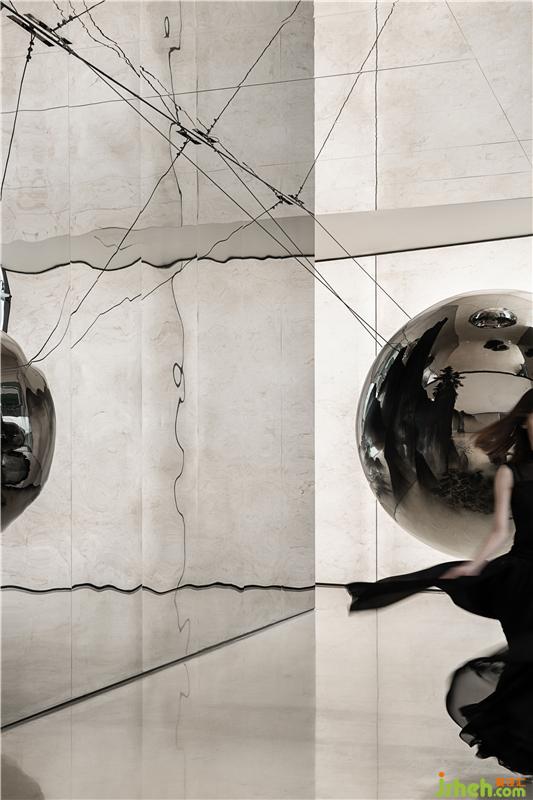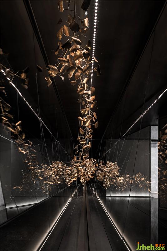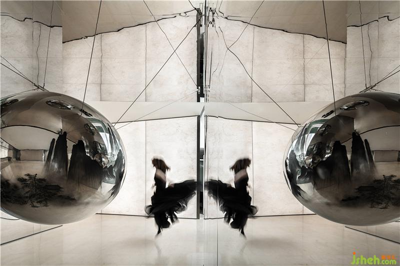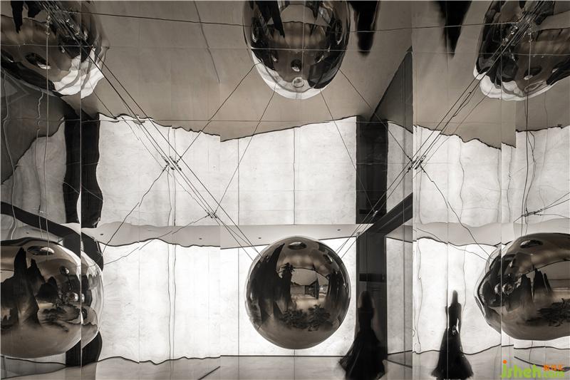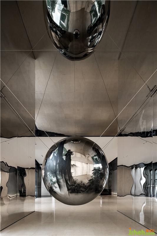 在前廳,觀看不僅僅是一種“看“,也是一種感知,一種設(shè)計(jì)對心智的喚醒。山水畫呈現(xiàn)懸于空中的金屬球面之上,因?yàn)闆]有滅點(diǎn)從而無法確定透視線。