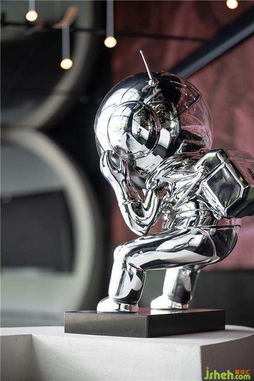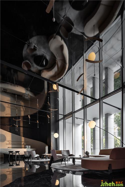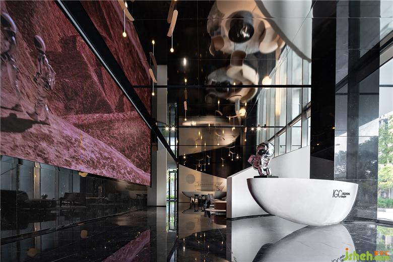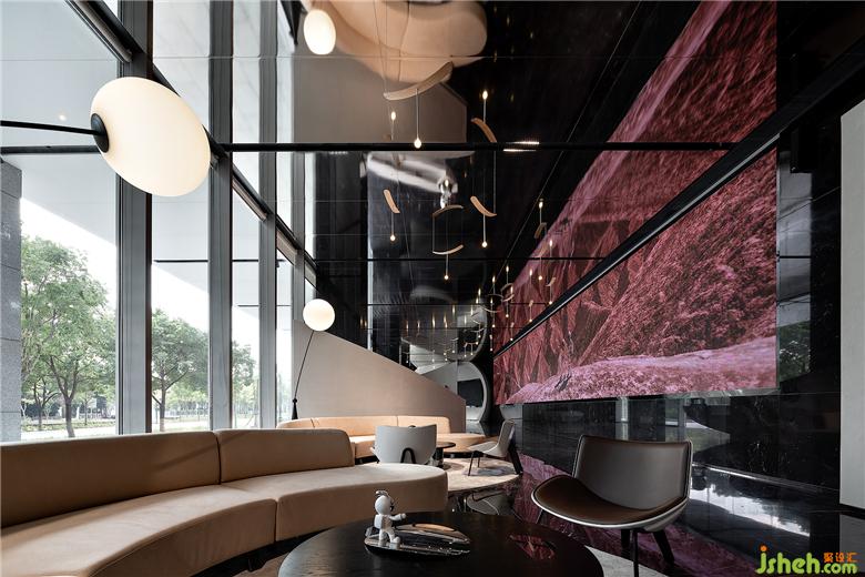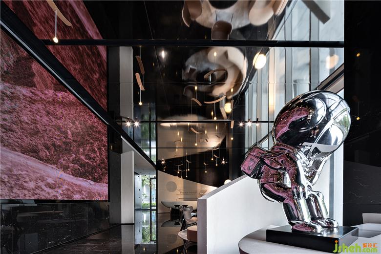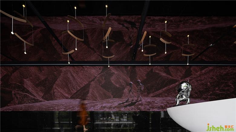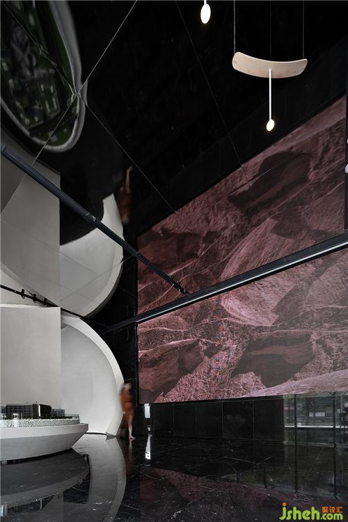 展示區(qū)設(shè)計黑色石材和鏡面的結(jié)合將整個空間向不同方向適度發(fā)散,擴(kuò)展著某種空無,這種空無感引發(fā)了關(guān)于風(fēng)的想象。