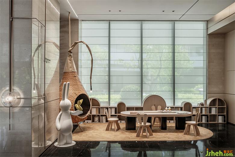 在后場(chǎng)空間中,公區(qū)設(shè)計(jì)以水吧臺(tái)為中心的回形動(dòng)線,連接起深度洽談區(qū)、私宴、茶室和兒童游戲區(qū),包裹的空間,產(chǎn)生了更為貼近的人際關(guān)系。