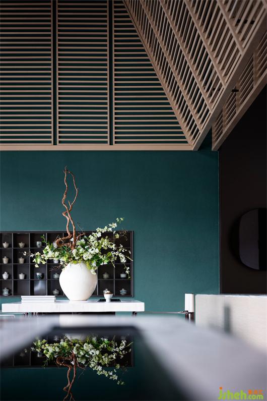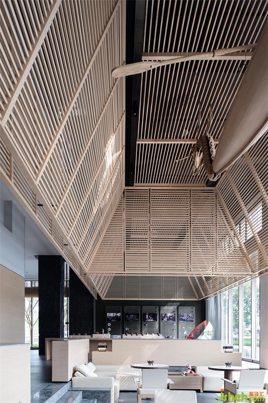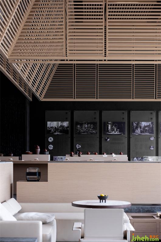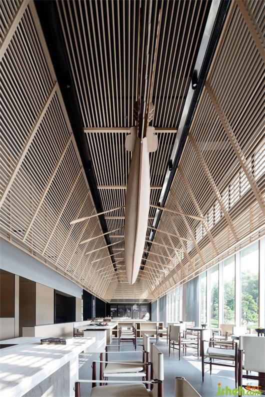在下沉的洽談區(qū),視線自然降低,自頂面籠罩的木構(gòu)宛若茶亭。取自清溪當?shù)貍鹘y(tǒng)競渡的龍舟凝固成一種想象,品茶之“靜”相較于龍舟之“動”,如漣漪之于水,激發(fā)著心靈和身體的感知。