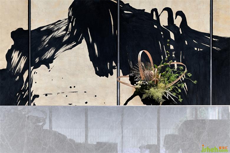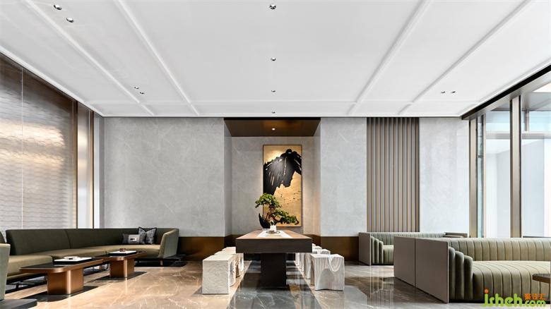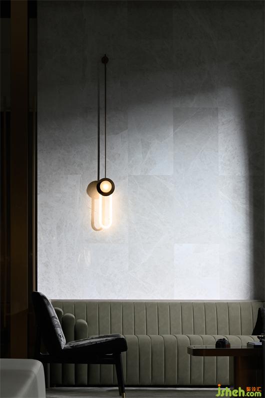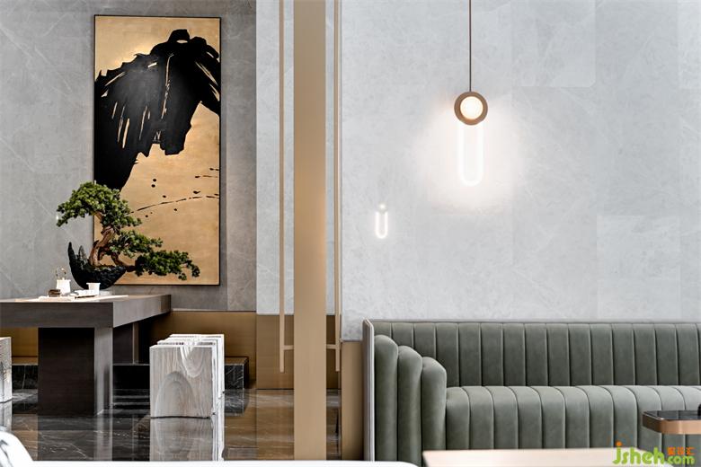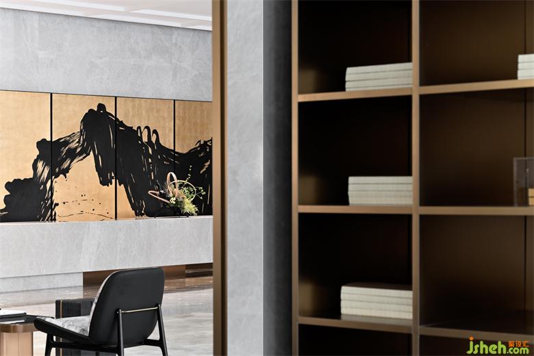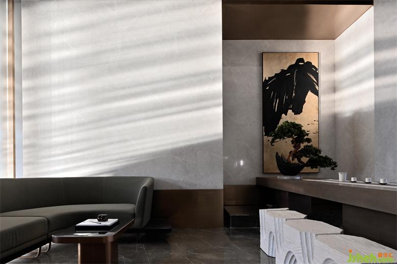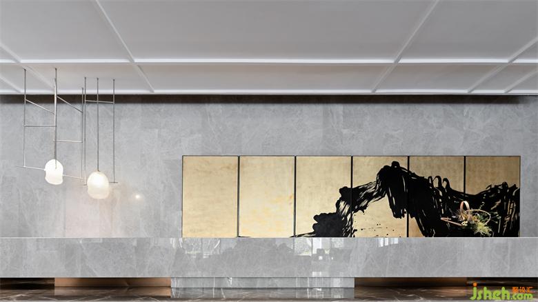 運用深淺兩種石材營造傳統(tǒng)水墨畫中虛實濃淡的視覺感知意境,呈現(xiàn)出一種儒雅式的靜謐。而工藝玻璃與霧化金屬的應(yīng)用,則給空間平添了幾分現(xiàn)代美學(xué)氛圍與輕奢品質(zhì)感。