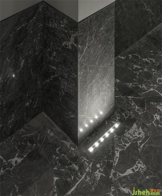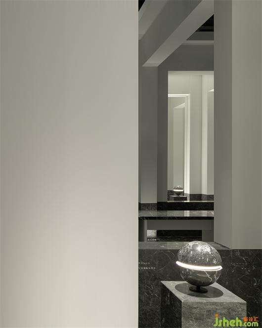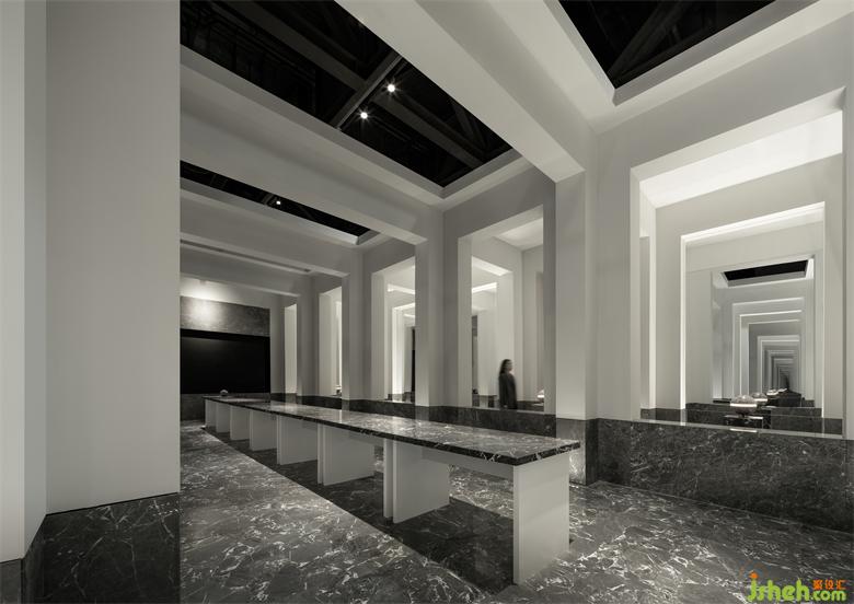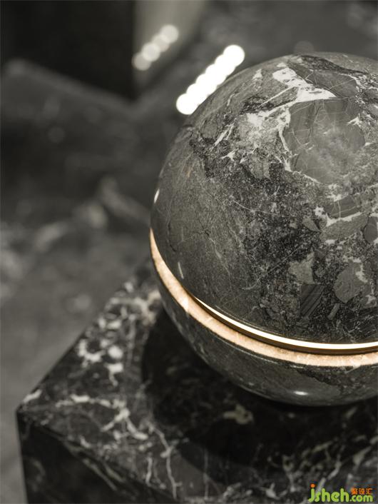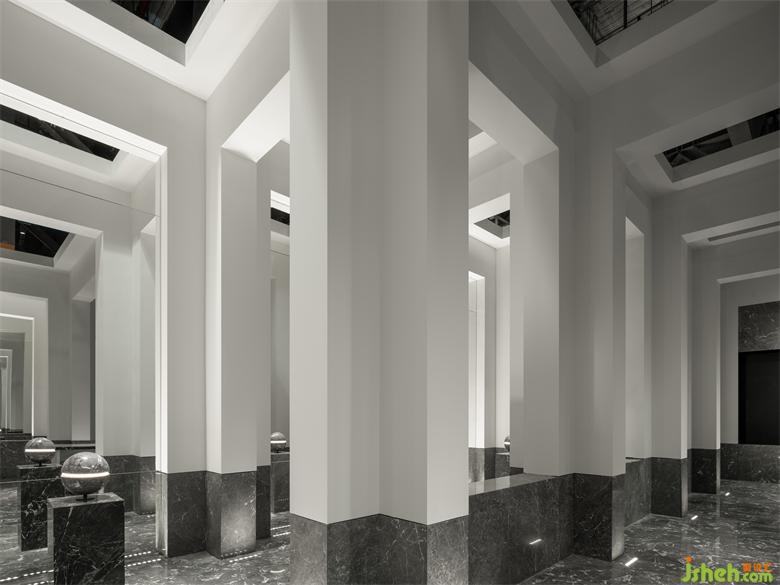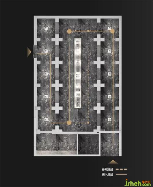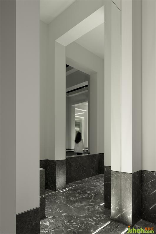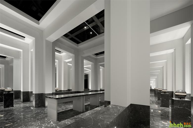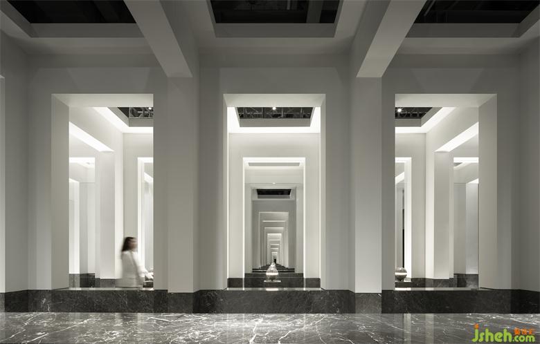 受帕特農(nóng)神廟空間構(gòu)成的啟示,展廳平面的核心空間與外圍廊柱形成一種神圣的陣列,展廳設(shè)計中軸對稱的布局展現(xiàn)出豐富的空間層次。行進(jìn)流線區(qū)域間放置的大理石裝置對應(yīng)著石材的未來感,在框景之中,為空間與人的交流、互動罩上一層神秘色彩。