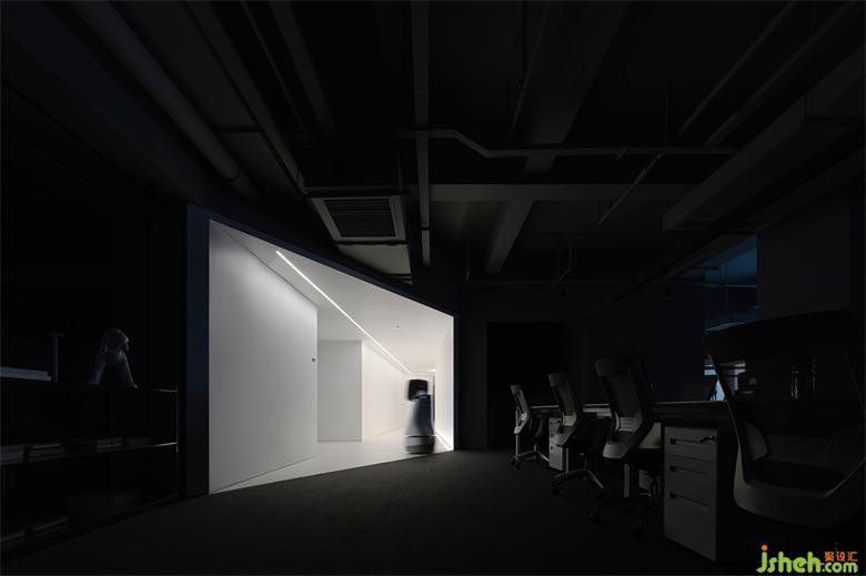 前廳的設計以一道斜向切口將空間分割成大小各異、一繁一簡兩個幾何體塊,辦公總部設計對角線加強空間景深關系,放大視覺沖擊力:三角體塊隱匿于黑色之中,只在留下框景式白色矩形接待臺;白色幾何大而舒展,以逐漸開闊的方式暗示著行進的方向。