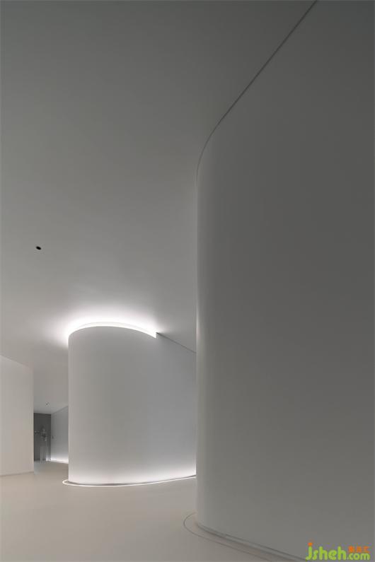 The white box is by no means a single spatial form here. Located in front of the L-shaped corner of the public office corridor, it forms a white tea room.