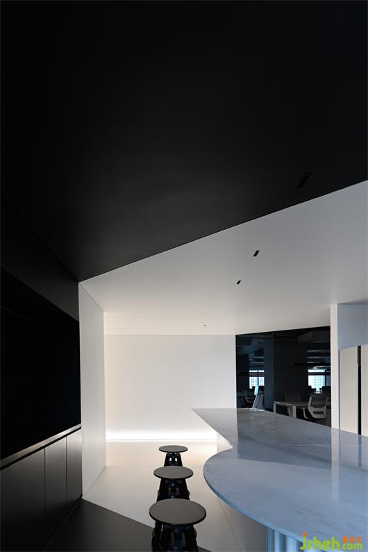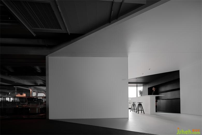 白色盒子的應用,在這里并非只是單一的空間形式,它在公共辦公區(qū)通道的L形轉角前方,形成白色茶水間。
