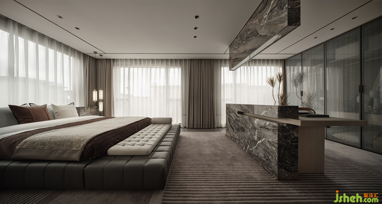 主人房空間相對(duì)自由。并置的不同視角弱化了各個(gè)區(qū)域的界限,人隨境而轉(zhuǎn),空間消弭了明顯的界限,也舒緩了居者的心境,為日常提供了豐富的體驗(yàn)與想象。