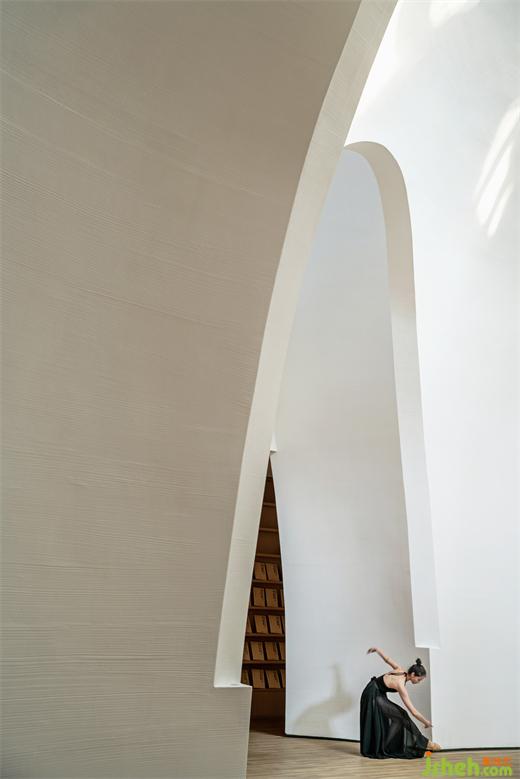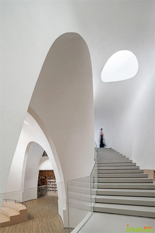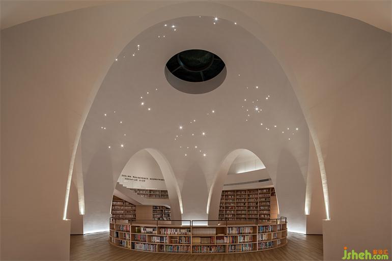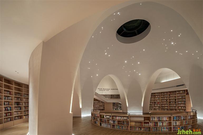 相對純粹的色彩表達結(jié)合輪廓弱化了柱體。在整個半弧形空間平面的盡端,是通往負一層書吧的入口,一片隱秘的星空靜待開啟。