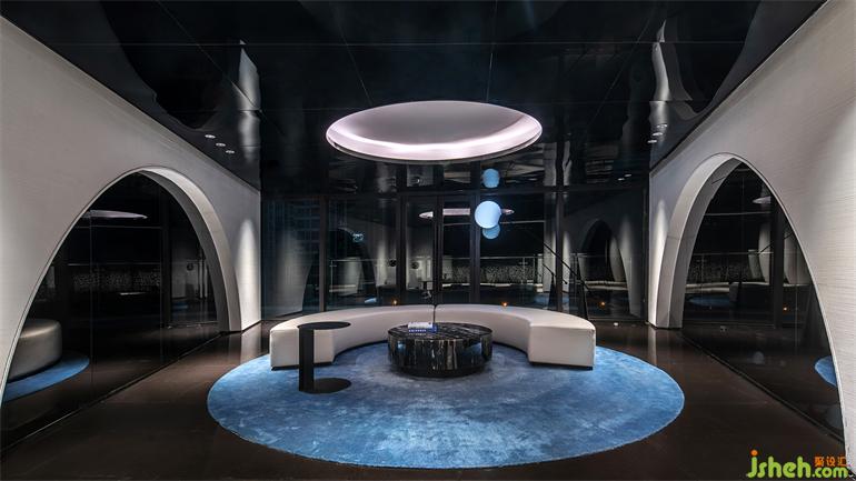 會所設(shè)計以暗色系為基調(diào),充滿未來感的裝置形成能量場,出現(xiàn)在三層會所。