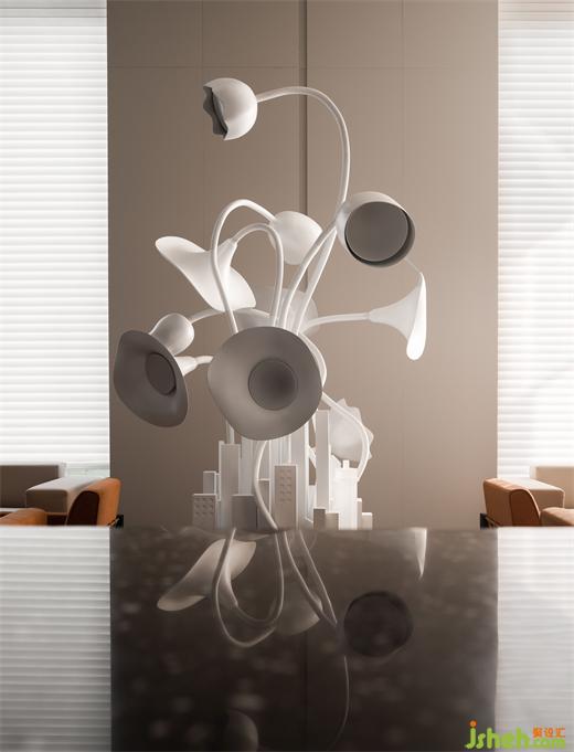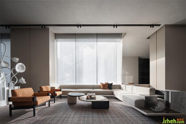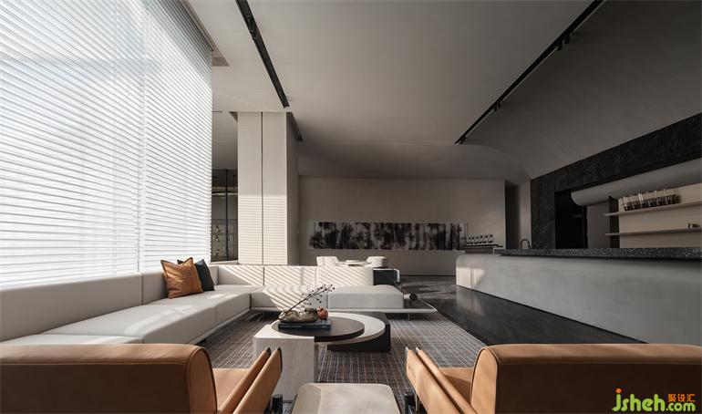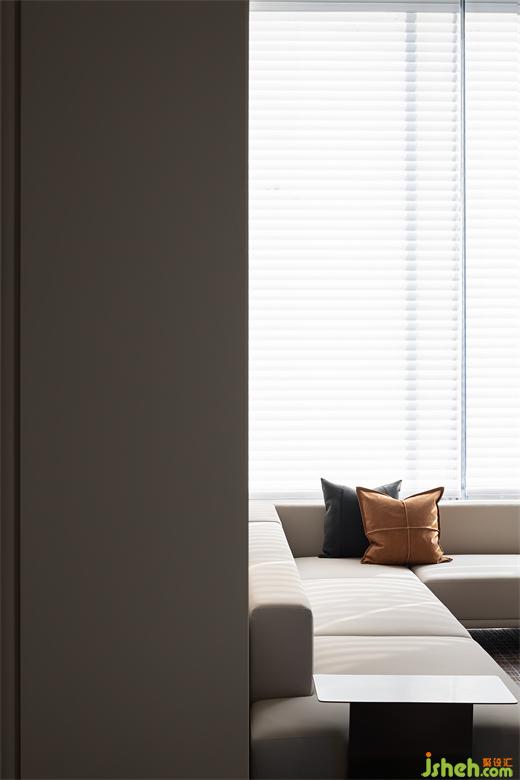 沙發(fā)座椅區(qū)位于沙盤與咖啡吧臺的對面,這里的空間重心開始微微下移,巨大的玻璃幕墻在其后,投下溫暖和煦的光斑,一種安靜的情緒縈繞其間,暗示為某種柔軟的、可以安放心身的歸屬感。