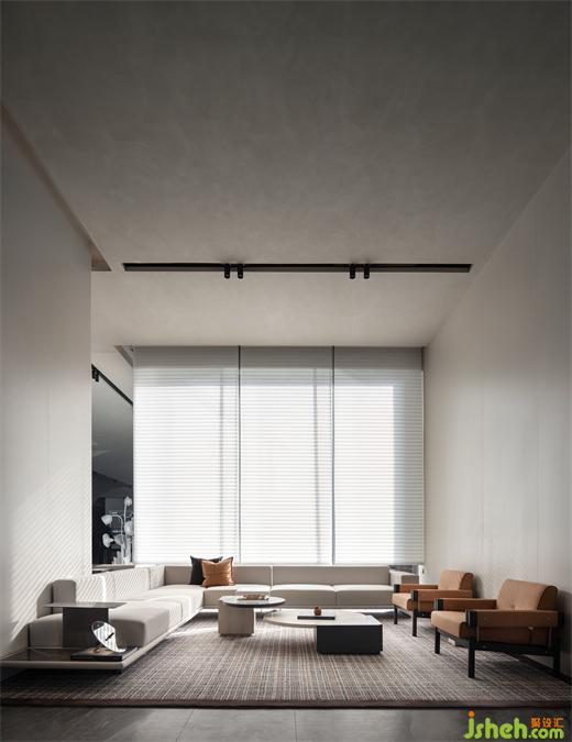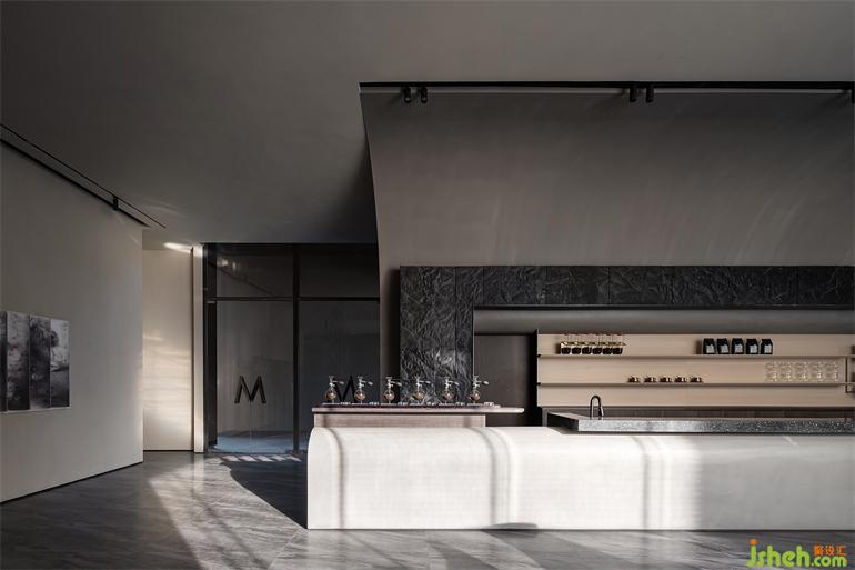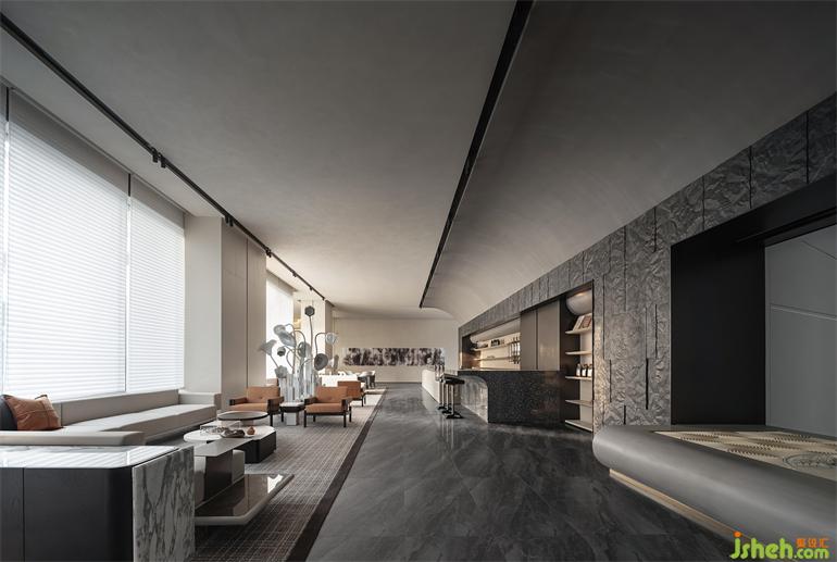 銷售中心設計從灰色的前廳進入,整個空間平面疏朗平緩,區(qū)域的形成并不依賴確定性的邊界,更多是由空間的場景感所引導。