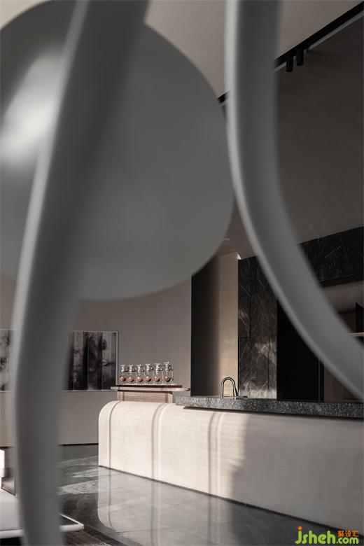 沙盤區(qū)域咖啡吧臺在前續(xù)的位置上相連,確立著空間動線的方向。與此同時,巨大的微水泥弧形曲墻面構(gòu)筑物,銷售中心設計將沙盤與咖啡吧臺微微向內(nèi)包裹,營造出輕松而熙攘的都市街頭氛圍。