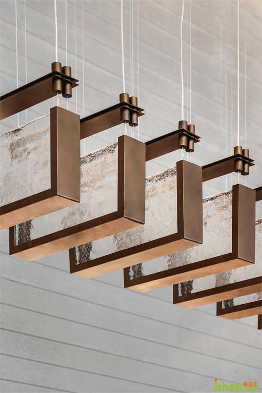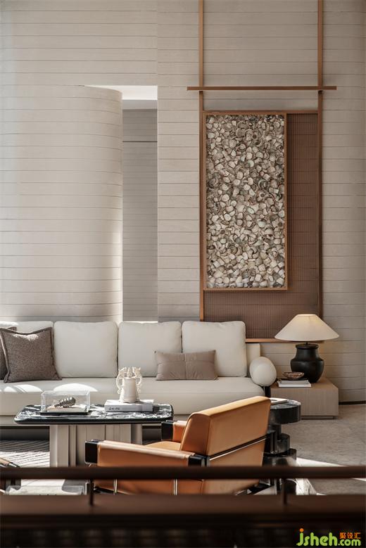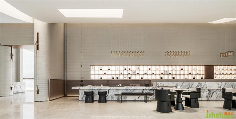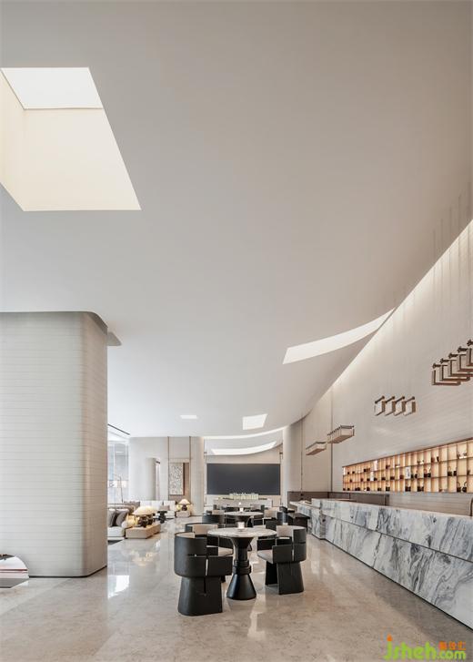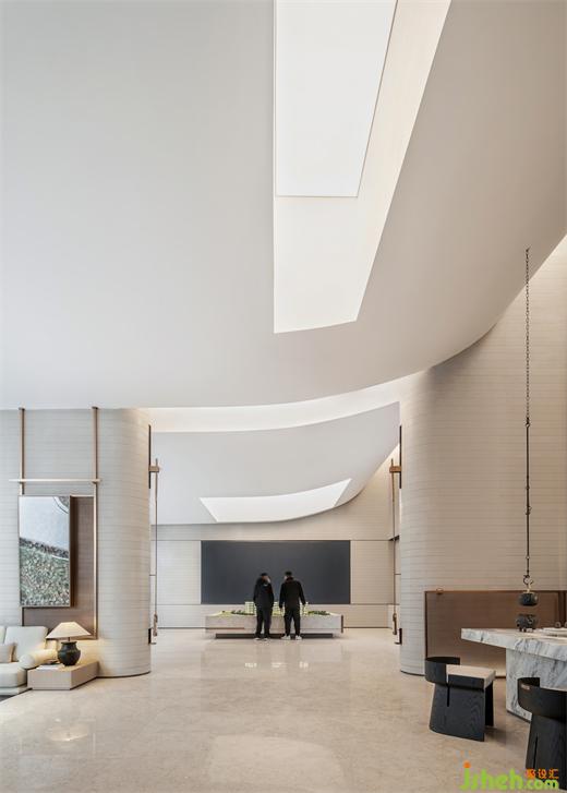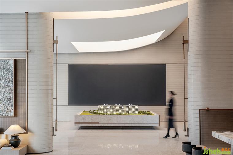 成都保利錦城和頌體驗(yàn)中心裝修設(shè)計(jì)師巧妙運(yùn)用引景與借景的手法,使得有限的空間營構(gòu)出無限的趣味。半凸于立面的空間被改造成品茗水榭,猶如水面上的亭子,放寬建筑的尺度,提供視野延伸的契機(jī)。臨水品茗,正對池中天地;繞池而行,水榭風(fēng)光成為立面點(diǎn)景;一引一借,互相交響成為彼此的神來之筆。