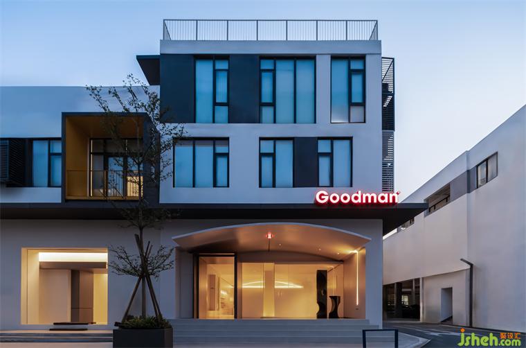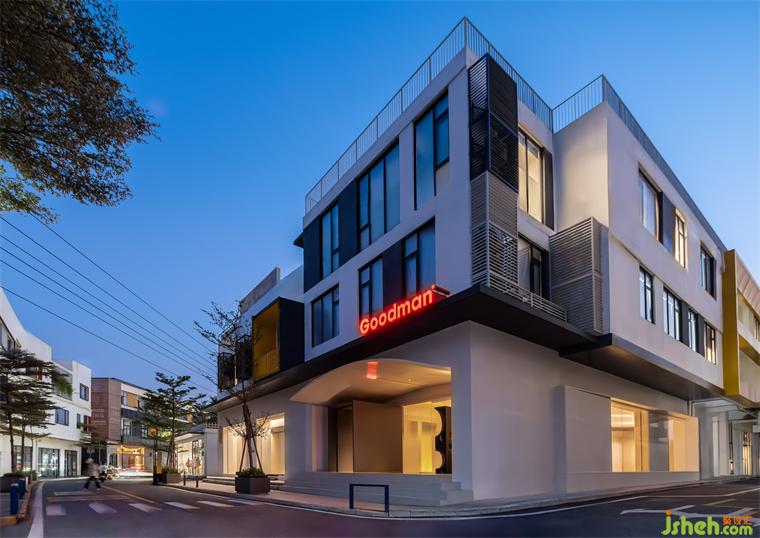 展廳側(cè)面面向園內(nèi)道路,大玻璃櫥窗的巧妙設(shè)計(jì),展廳設(shè)計(jì)把外立面的不利條件包裹,使室內(nèi)日與夜的不同氛圍如海報(bào)畫般隨時(shí)間流逝而切換呈現(xiàn)。此刻如隱歸于此,感受時(shí)光緩緩流轉(zhuǎn),如夢(mèng)恬靜。