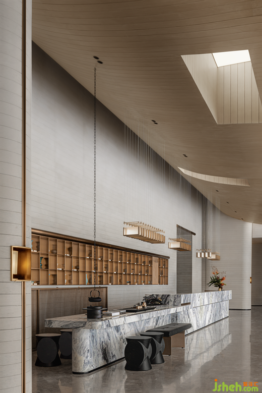 成都營銷中心設計在大尺度開合的空間內(nèi)部,時間感下沉,空間節(jié)奏低緩,氣質(zhì)沉靜內(nèi)斂,大理石地面的倒映出人與物的綽約,呈現(xiàn)出水的溫潤光澤。視知覺在潛意識中被空間所引導:沙發(fā)區(qū)下沉,制造高低的視差關系;與此同時,天頂亦呈流線型弧面,向景觀的方向傾斜,共同將視線引向中庭水景。