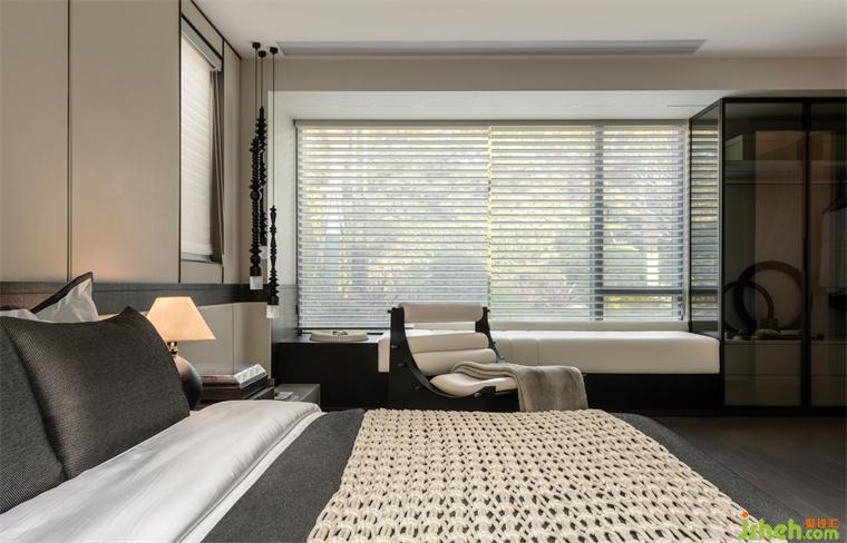顏色、材質(zhì)、光線(xiàn)恰如其分地調(diào)和著空間的氛圍。深色夯實(shí)致密,穩(wěn)定著空間的情緒;淺色素潔淡雅,大面積地延伸著,帶來(lái)深長(zhǎng)而均勻的呼吸感;陽(yáng)光于左右兩側(cè)玻璃窗照射進(jìn)來(lái),百葉窗的影子里,仿佛也充滿(mǎn)了隱秘的流動(dòng)的力量。