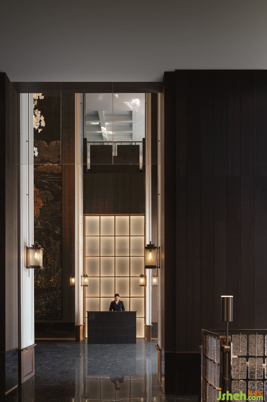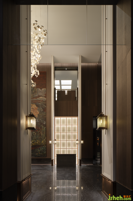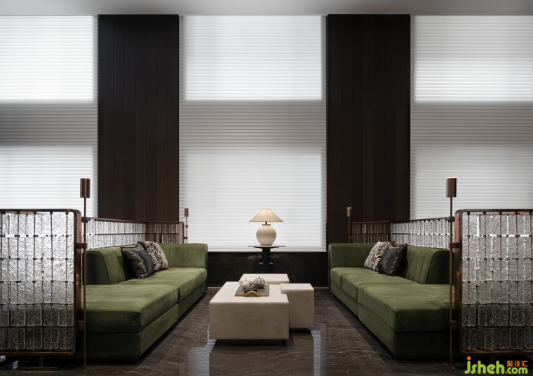 售樓處設(shè)計(jì)大堂高度為9.6米,配合兩側(cè)對(duì)稱的8扇屏風(fēng),強(qiáng)調(diào)空間中的氣勢(shì)與秩序。