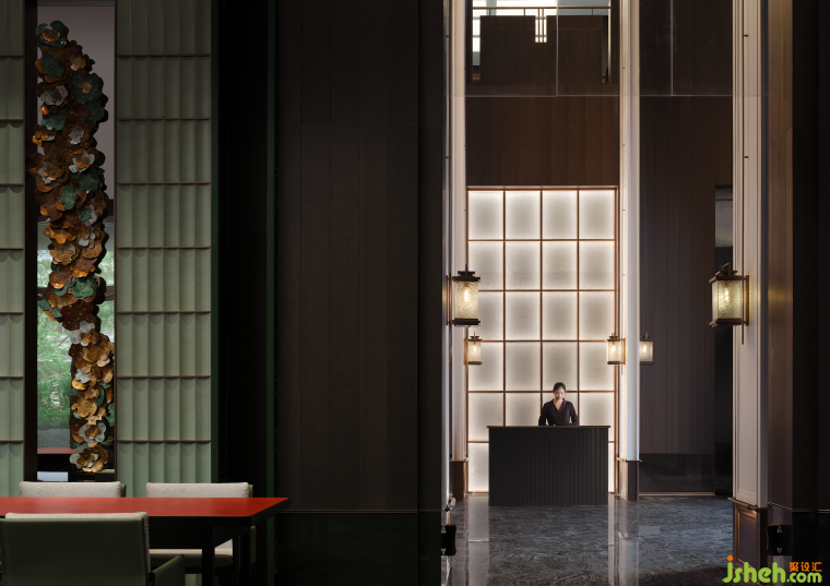預(yù)接待區(qū)域以謙和之姿置于空間一隅,背景似釉面流光的溫潤,隱而不顯,為淡然、樸素卻又充滿深意的空間定調(diào)。