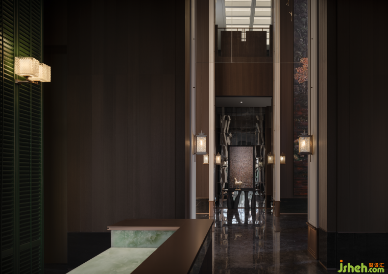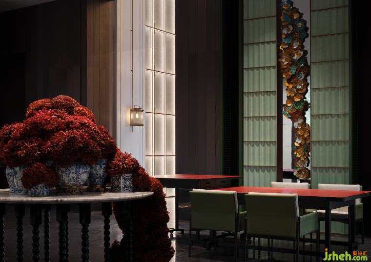 大堂中央的藝術(shù)吊飾成為空間的視覺錨點(diǎn),兩側(cè)的壁畫與裝置本身強(qiáng)烈的色彩稍顯出離,同硬裝效果有一定反差,這成為空間視覺感中的小小遺憾,但自上而下的懸掛結(jié)構(gòu)形成一種動(dòng)態(tài),秩序與流動(dòng)感之間得以相互作用。