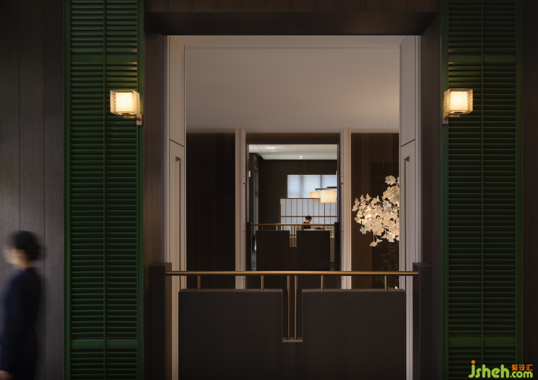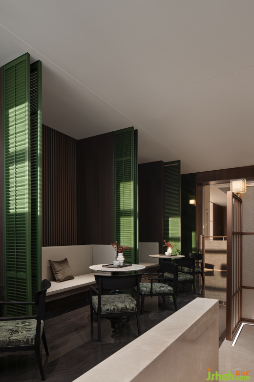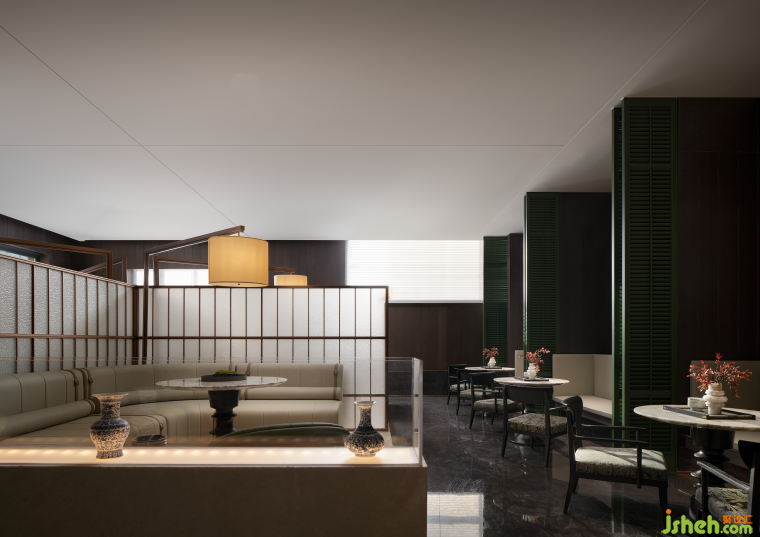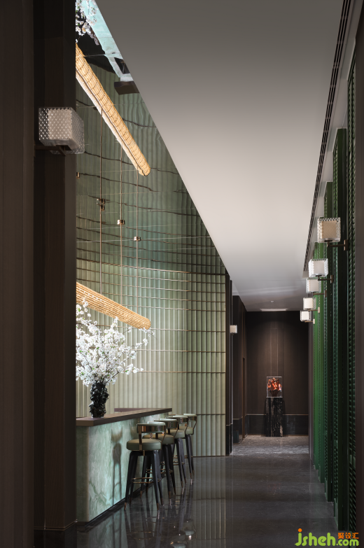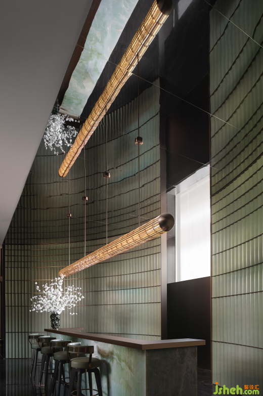 水吧墻面接近汝窯瓷器質(zhì)感的釉面手工磚,使空間彌漫著溫潤(rùn)內(nèi)斂的氣息。與釉面相呼應(yīng),水吧臺(tái)采用玉石,呈現(xiàn)出瓷質(zhì)般的細(xì)膩。鏡面不銹鋼天花拉伸了空間的視覺高度并將光影反射出豐富的層次感。