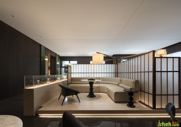 二層洽談區(qū)域相對(duì)抬高,如構(gòu)建一個(gè)微型舞臺(tái),有潛在的儀式感與焦點(diǎn)效應(yīng)。藝術(shù)玻璃制成的L形屏風(fēng),融合圍合與通透,既保持空間的隱私感,又讓光線在透明與半遮蔽之間自由流淌。