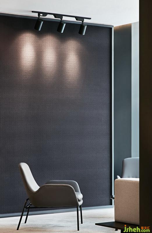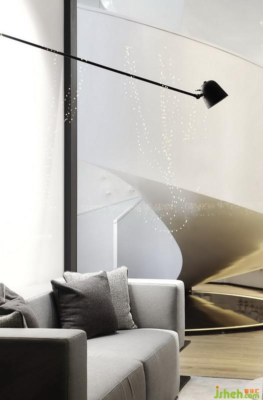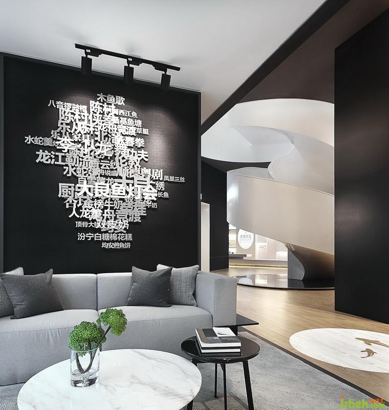 該項目設(shè)計面積并不大,一層由四間臨街商鋪打通,公共區(qū)域?qū)⒔灏倨椒矫?,二層辦公區(qū)將近三百平方米。作為帶有展示性質(zhì)的銷售中心而言,面積和可能的人流所需參觀面積相較,略顯逼仄。要營造相對活潑,富有節(jié)奏感的空間環(huán)境,相對不易。室內(nèi)設(shè)計師在考慮平面時,在滿足剛性要求的空間切割之后,將一二層之間的梯道以“舞動”的概念設(shè)計成白色旋梯,將空間的結(jié)構(gòu)線條在此交匯,旋轉(zhuǎn),升騰,又由此處擴散到空間的結(jié)構(gòu)當中。它成為空間中極規(guī)整的線條組織在人的視覺體驗里靈動的部分,使得整個空間結(jié)構(gòu)有序而不呆板。