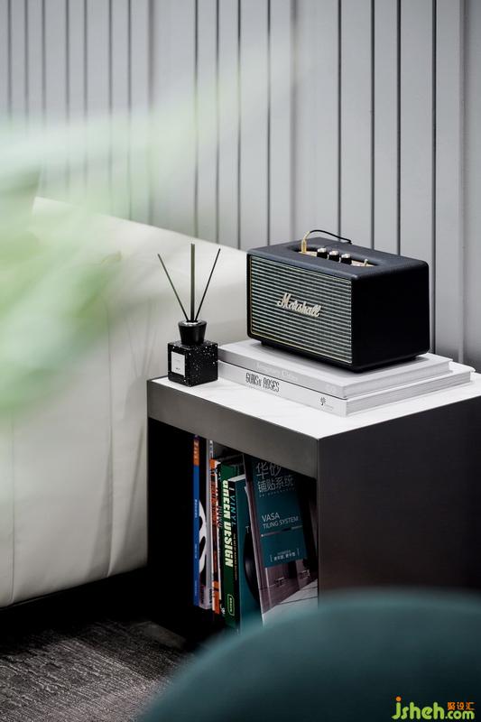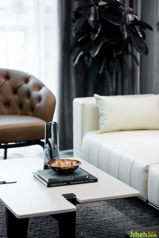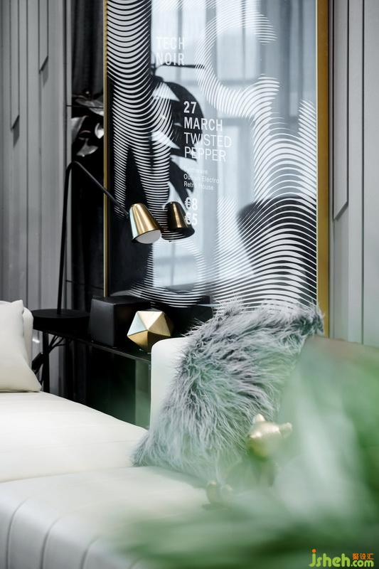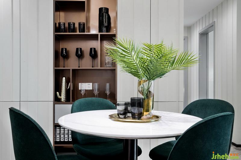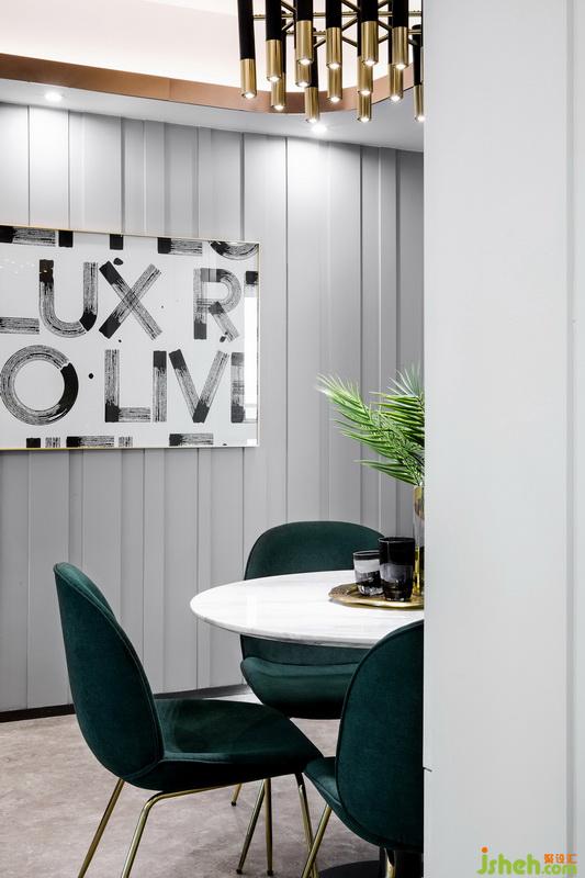 在客廳的處理上,設(shè)計(jì)師在墻面采用約20度的灰與約80度重灰色絲絨窗簾形成整個空間的主色彩基調(diào),而配以濃重的綠色大株植物為點(diǎn)綴,用米白的真皮沙發(fā),復(fù)古的真皮拉扣單椅,marshall藍(lán)牙音箱,紳士的金色的方耳熊,搭配超大號的狐貍毛抱枕,豐富空間的色彩層次和體塊變化。作為這一配搭色彩在主要空間的延伸,室內(nèi)設(shè)計(jì)師同樣在餐廳采用雪松綠的餐椅搭配大理石臺面的餐桌和金色的裝飾柜,強(qiáng)調(diào)屋主的生活品味。