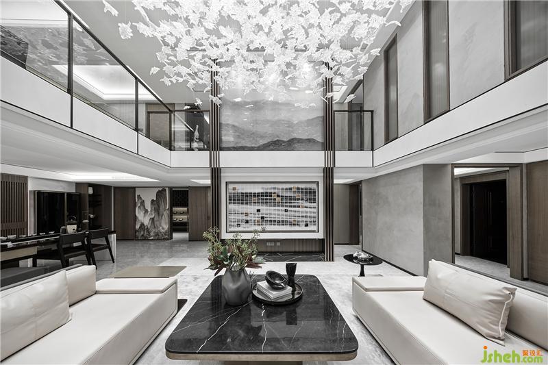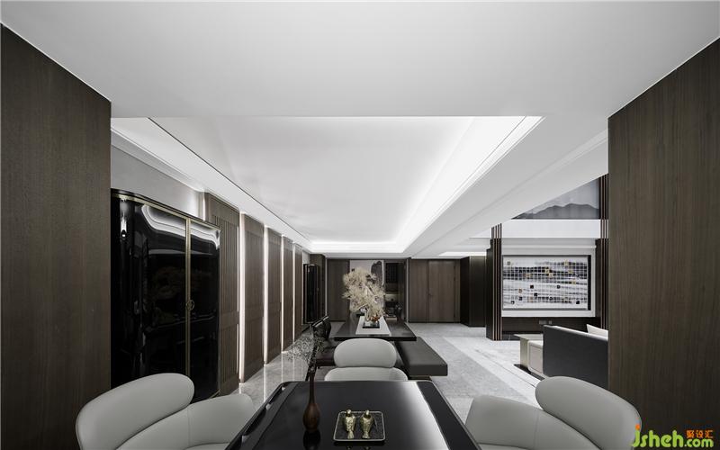 聚會(huì)區(qū)與棋牌區(qū)在夾層書房的下方,山水做題,青松寫意,猶如山居長(zhǎng)卷中的閑然筆觸,皴法了了,情趣怡然。別墅樣板房設(shè)計(jì)