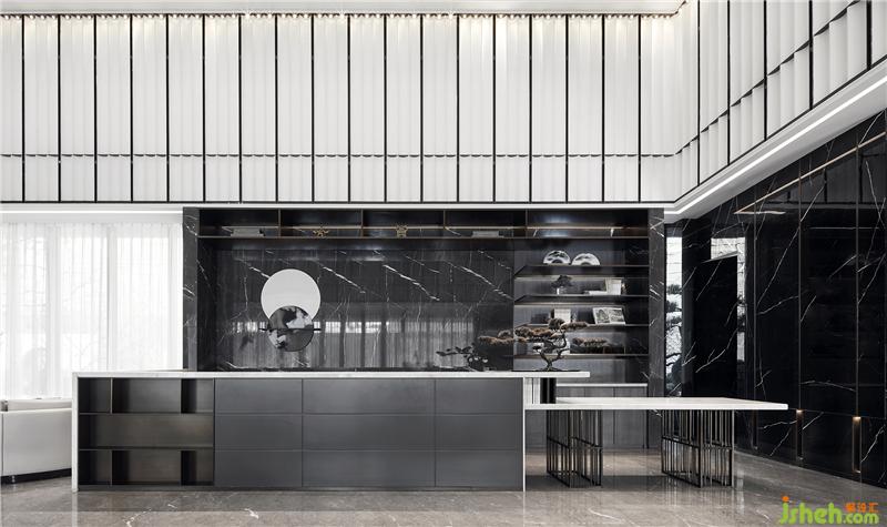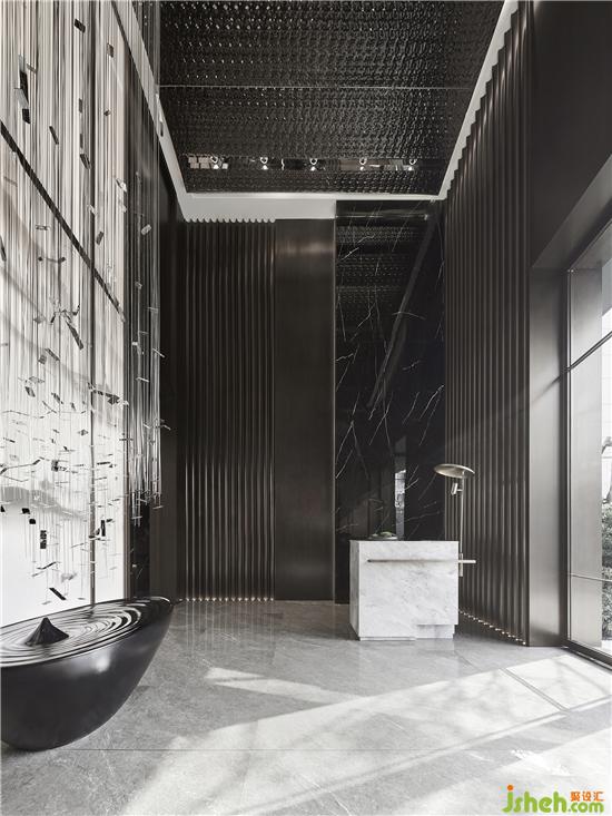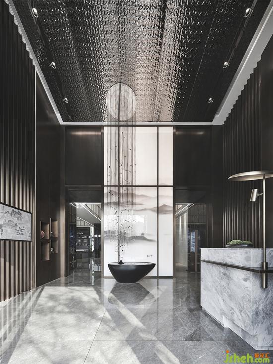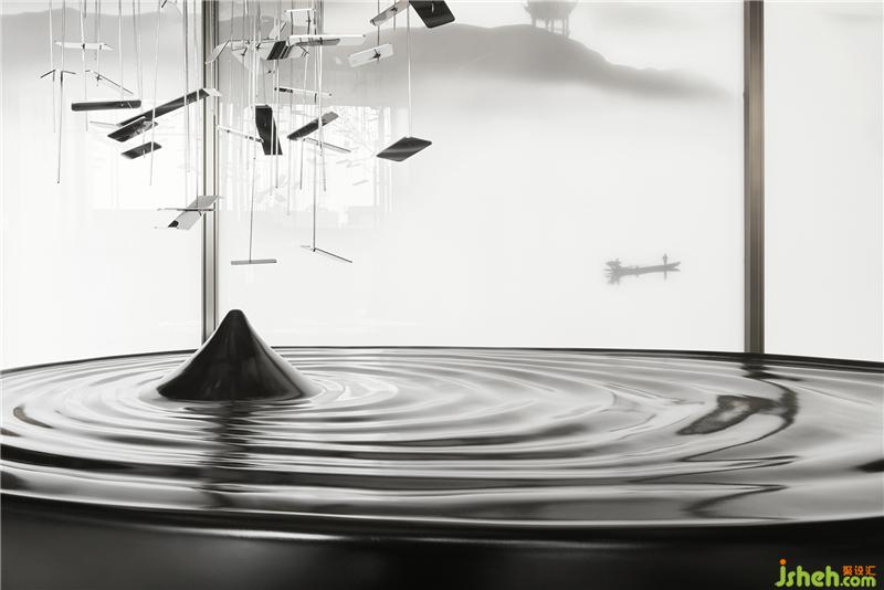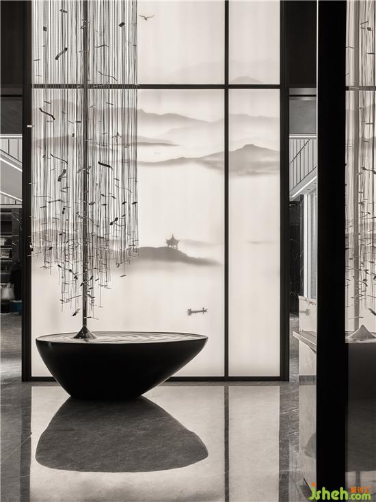 超白夾絹玻璃映襯出一幅“浮萍破處見山影,小艇歸時(shí)聞草聲”的悠然畫卷。光線從吊頂波紋不銹鋼的邊緣沿線條垂流而下,凝固在水滴漣漪的藝術(shù)裝置上,使人走入其間,如與自然共棲,相得益彰。會所設(shè)計(jì)