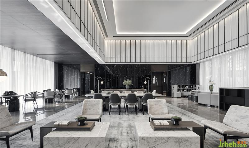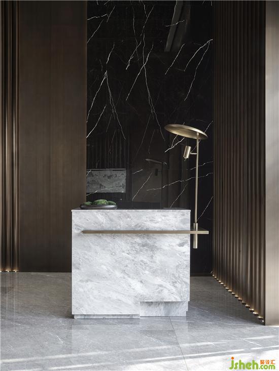 洽談區(qū)寬敞舒怡,光線通亮。意大利灰大理石地面從門廳延伸至此,墻面則選用色系穩(wěn)重、紋路清晰的保加利亞灰?guī)r板,平和的氛圍中帶著些許靈動之氣。
