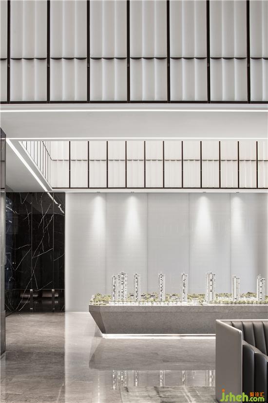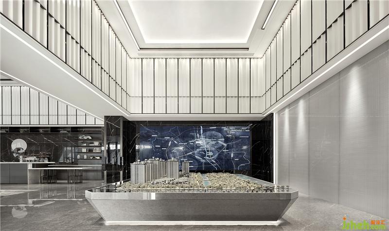 從門廳至洽談區(qū),沙盤落在空間之中,整個(gè)沙盤區(qū)線條簡潔,層次分明,突出了運(yùn)河旁多樣住宅形制的樓盤特點(diǎn),簡明意賅。