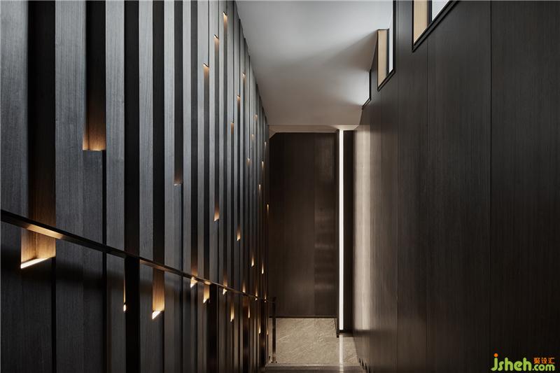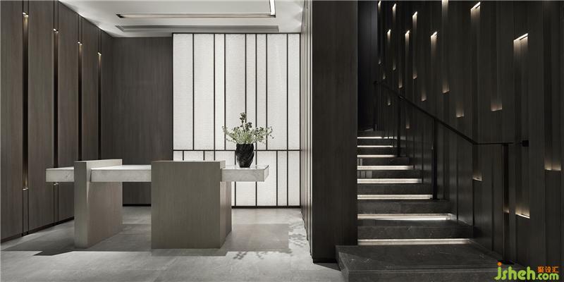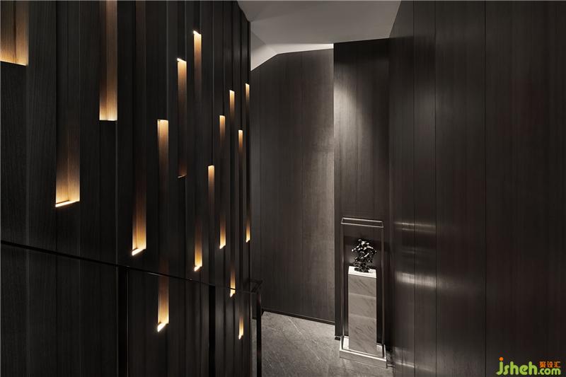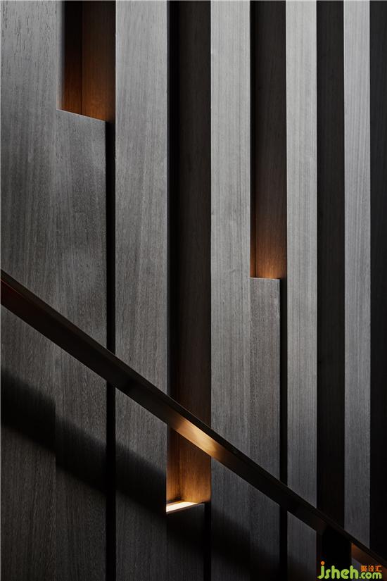 木飾面立方體交錯(cuò)拼接而成的墻面占滿樓梯一側(cè)空間,光束沿著內(nèi)凹體塊循序漸變,歷史的厚重感不言而喻,這是光與空間共造的藝術(shù)。會(huì)所設(shè)計(jì)