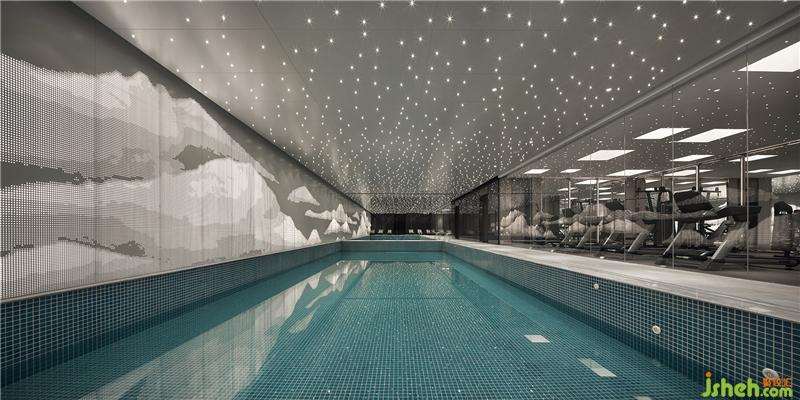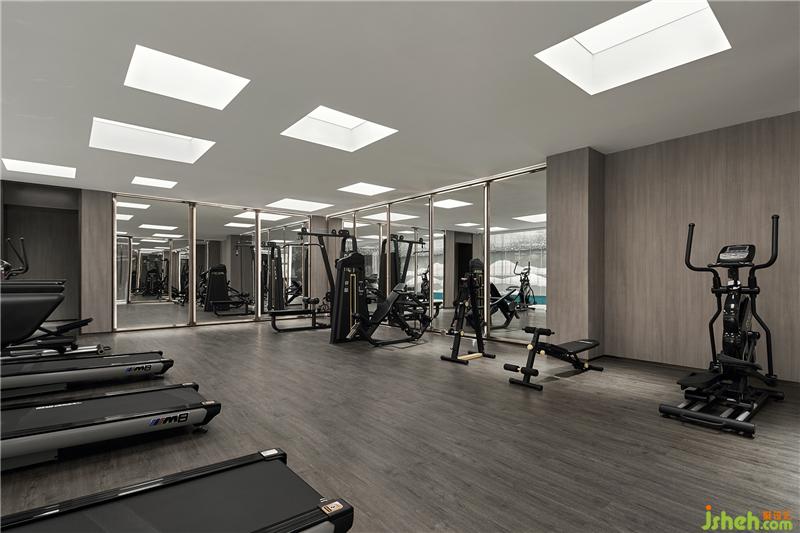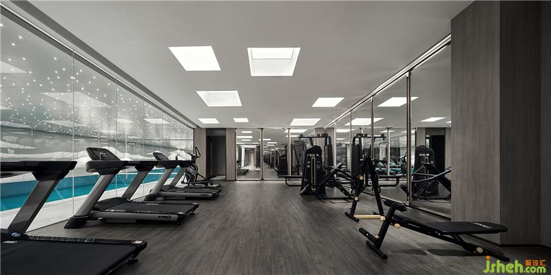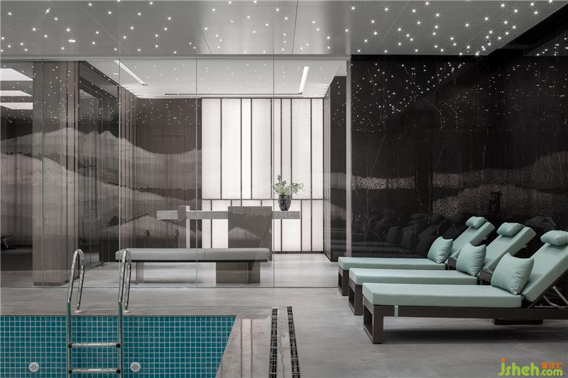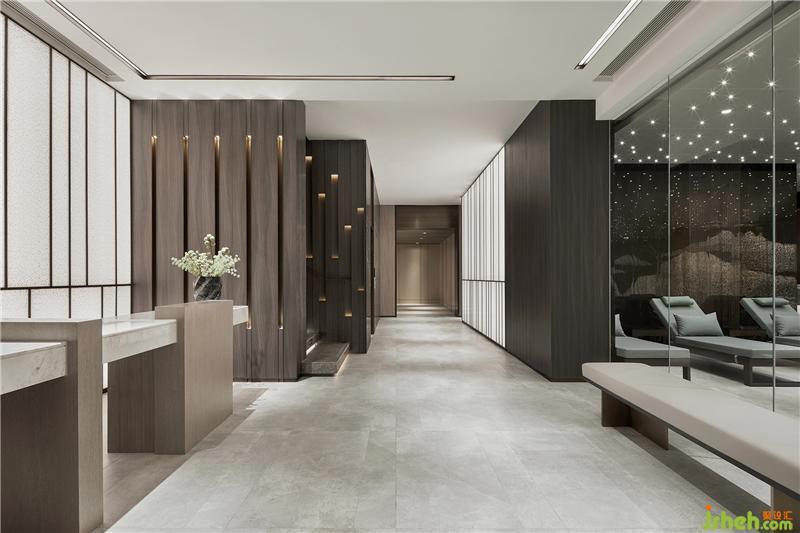 泳池墻面,用現(xiàn)代手法詮釋著江南山水,吊頂星光點(diǎn)點(diǎn),趣味盎然。休息區(qū)墻面采用保加利亞灰?guī)r板,反射了空間光線,通透輕靈。健身房大面積木紋,則使之充滿自然氣息。更衣室沿用暖灰色調(diào),大理石與木紋搭配,質(zhì)雅低調(diào)。會(huì)所設(shè)計(jì)