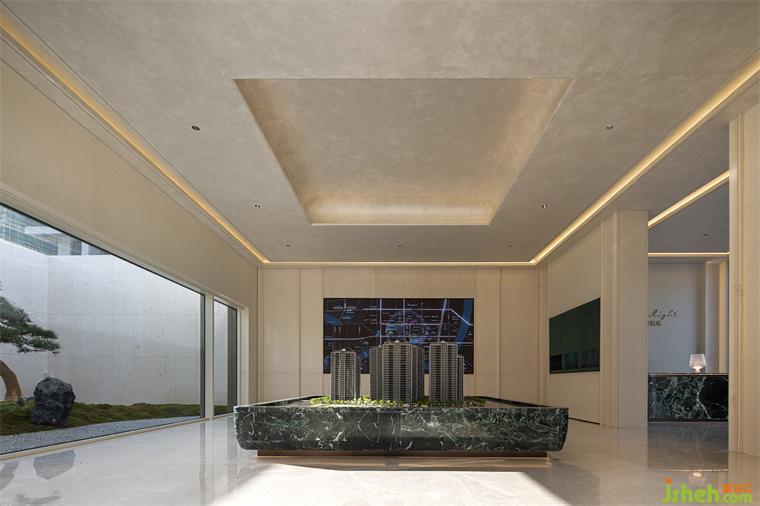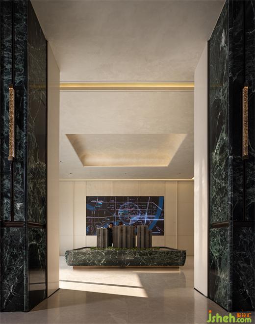 沙盤區(qū),凝結(jié)了時(shí)光的厚度與生活的構(gòu)想。溫潤(rùn)的米黃色勾勒出空間基調(diào),紋理在靜與動(dòng)之間若隱若現(xiàn),自然質(zhì)感與美學(xué)氣息在此交融。綠色大理石穿行其間,在這里,微觀的建筑布局,精致而有序,描繪出未來(lái)的生活藍(lán)圖,托起了對(duì)理想生活的敬仰。