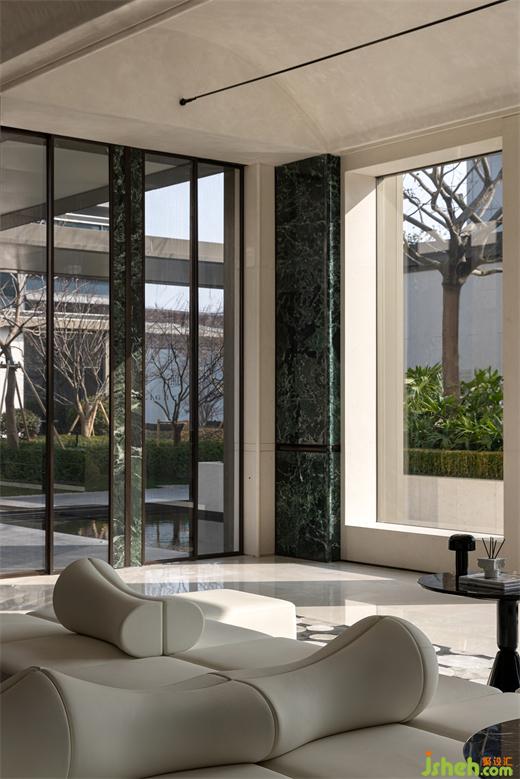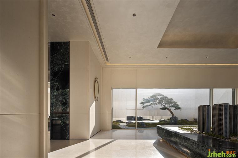售樓處設(shè)計(jì)落地玻璃窗引入了自然光的柔和筆觸,捕捉著外界光影的漣漪,短暫停留,沉思與啟發(fā)。金屬線條在空間一隅靜默,卻有聲,以微妙的細(xì)節(jié)反射出時(shí)間內(nèi)化的靈動(dòng)和多變,默默訴說著空間的樸素與細(xì)致。窗戶框出了室外庭院的精致景觀,搭配內(nèi)部潔凈的曲線家具,流暢的視線穿梭于室內(nèi)外,將大自然的靜謐與都市的現(xiàn)代感融為一體。