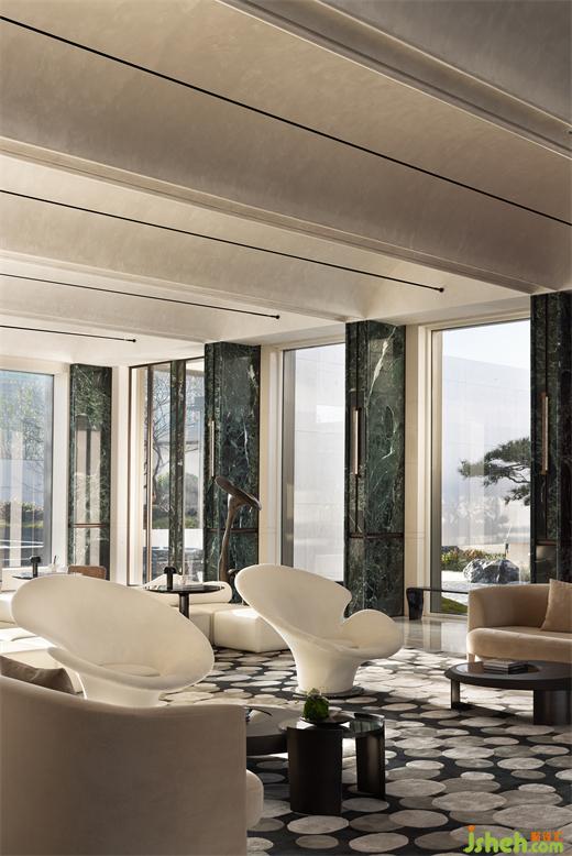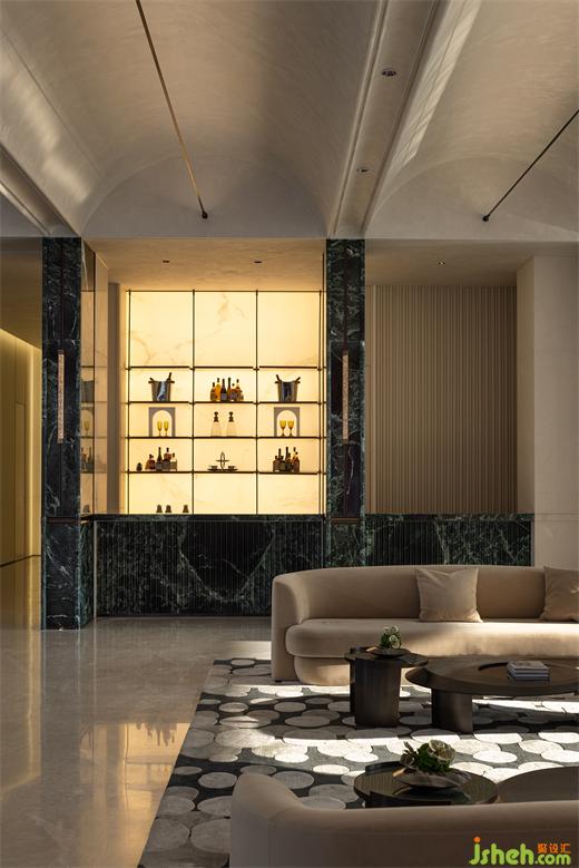 大理石特有的色澤與紋理,在洽談區(qū)中不僅傳達(dá)出形式上的美感,更深層次地引發(fā)了對(duì)和諧共生生活方式的思考。深色啞光金屬與天然石材的深綠,延伸出空間的深度與復(fù)雜性,反映出設(shè)計(jì)者對(duì)細(xì)節(jié)的精細(xì)打磨與對(duì)空間情感的細(xì)膩捕捉。拱形的設(shè)計(jì)元素貫穿其間,其柔和的曲線與空間的線條相映成趣,如同古典詩(shī)篇中流淌的旋律,引領(lǐng)著訪客步入更加深遠(yuǎn)的對(duì)話與探索之中。