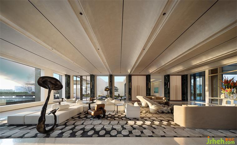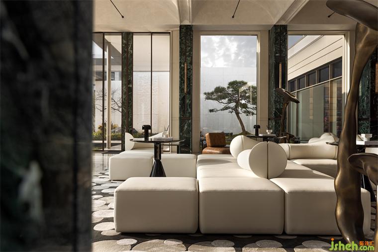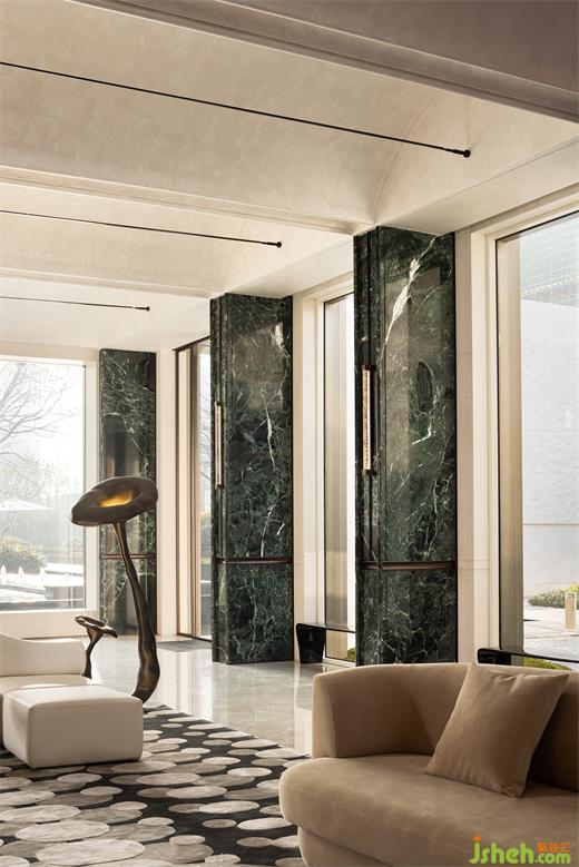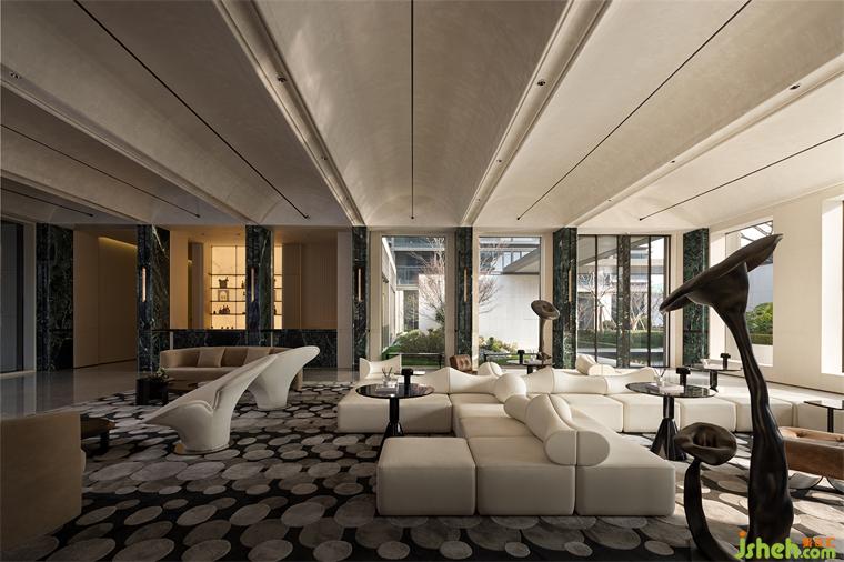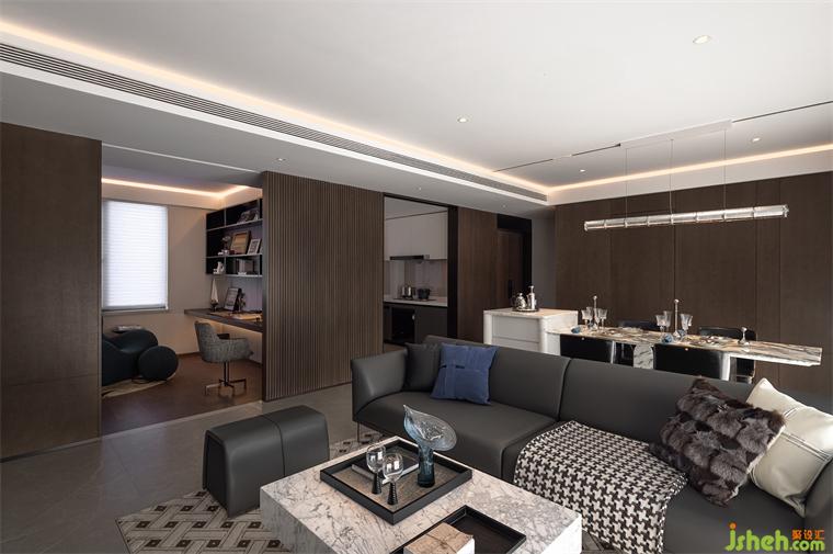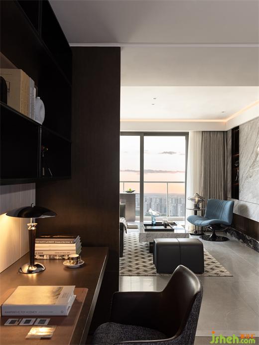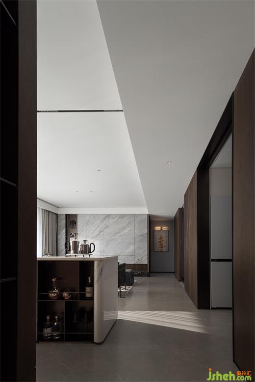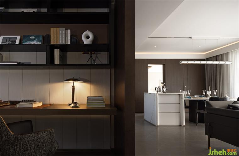 售樓處設(shè)計客餐廳的開放式布局與精心挑選的材質(zhì)相得益彰,書房與客餐廳之間的無形界限既巧妙又實用?;艺{(diào)的大理石地面延伸至每一角落,與之和諧搭配的墻體木飾面,如同自然光線下河流的倒影,靜謐而生動。在這里,閱讀的寧靜和餐飲的熱鬧不再是對立,面對生活的更多可能。