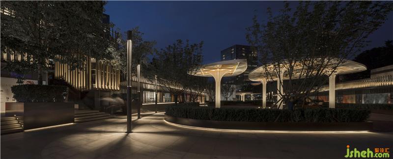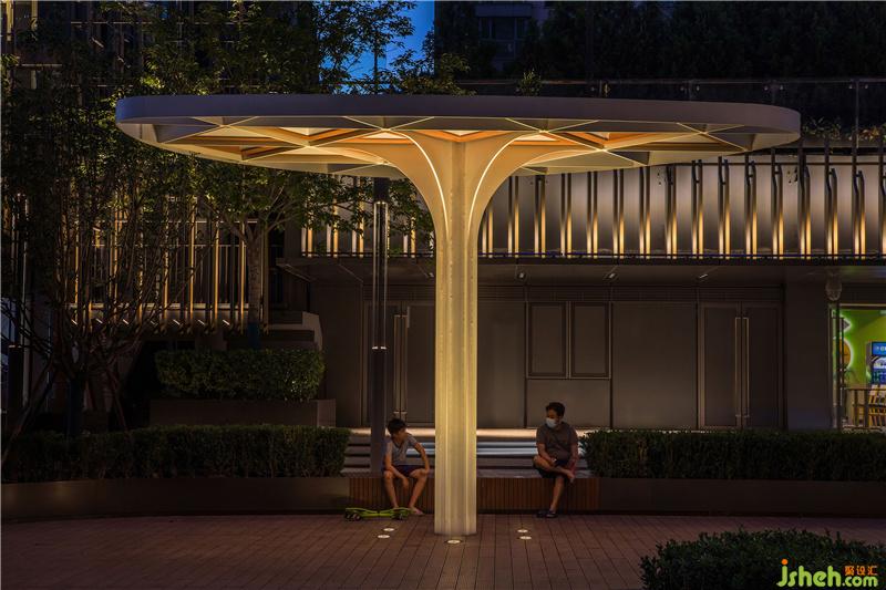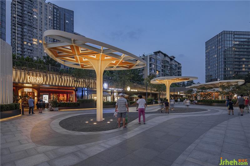 商業(yè)街的照明設(shè)計基調(diào)干凈自然,整體亮度被妥善控制。設(shè)計師克制地將商業(yè)街和住宅區(qū)的亮度比設(shè)定在10:1,以達到整體視覺效果的平衡與和諧??紤]到采用彩色和動態(tài)光線對周邊環(huán)境產(chǎn)生的光污染與噪音污染(人們與光線互動時產(chǎn)生的噪音),摒棄商業(yè)街區(qū)照明設(shè)計中這一慣用方法,因地制宜地采用純凈的白色和溫暖的黃色來凸顯空間整體的自然特質(zhì),營造更加生活化、輕松高級的休閑購物社交場所。Exquisite Lighting Empowers Business