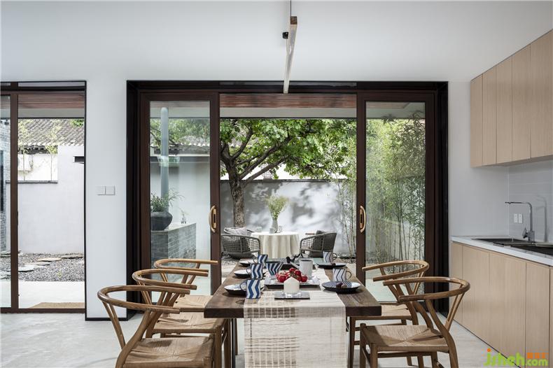 為保障戶外活動(dòng)無(wú)懼陰雨和暴曬,建筑在南向設(shè)置了玻璃雨棚,并以木格柵形成光線的過(guò)濾。室內(nèi)設(shè)計(jì)師同時(shí),灰空間的留存是對(duì)傳統(tǒng)建筑形制“風(fēng)雨連廊”的追憶,兼具功能和情感價(jià)值。