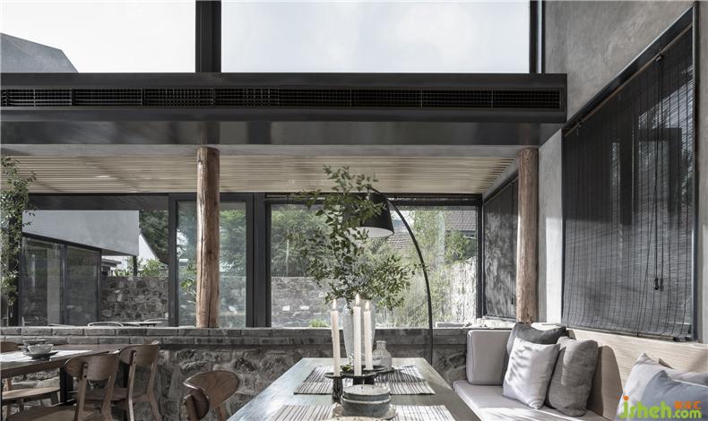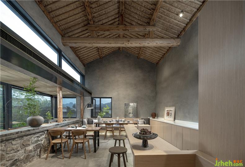 為了滿足商業(yè)屬性空間應(yīng)有的尺度感與使用靈活性,建筑師將坐北朝南的主體建筑加高至兩層并做了通高處理,容納室內(nèi)就餐活動(dòng)。“廊下空間”由“紅果樹”延續(xù)至此,滿足半室外就餐的需求。而庭院之中,室內(nèi)設(shè)計(jì)師暖色編織質(zhì)感的沙發(fā)椅圍合出一種歡聚的氛圍,水泥花壇里野蠻生長(zhǎng)的綠植、竹子與石墻面為近景,矮山與藍(lán)天為遠(yuǎn)景,讓就餐的氛圍更加“原生態(tài)”。