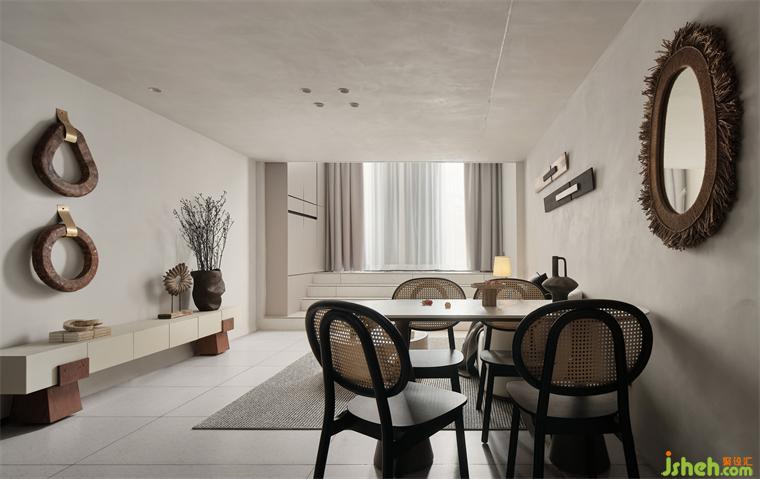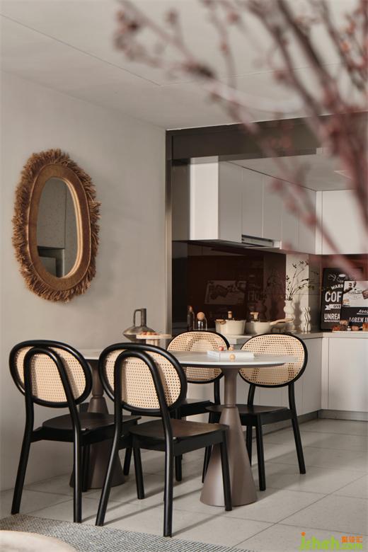 與家人享受一餐飯的相聚,家的溫度也在這種親近中慢慢升溫.在就餐場(chǎng)景的營(yíng)造中,民宿裝修設(shè)計(jì)通過冷暖材質(zhì)的對(duì)撞,奇妙的反差感為就餐增加了豐富的趣味性.小體量空間中的功能復(fù)合,通過使用場(chǎng)景交叉來豐富體驗(yàn)感受.