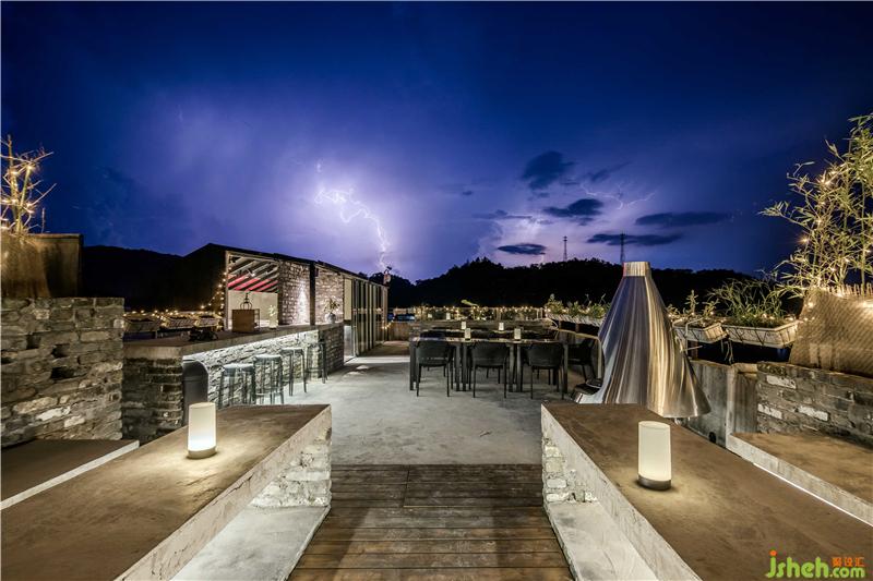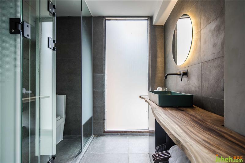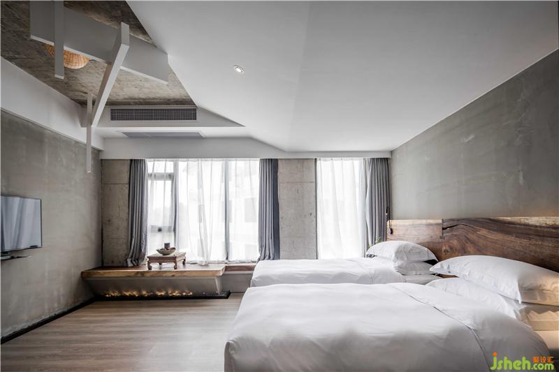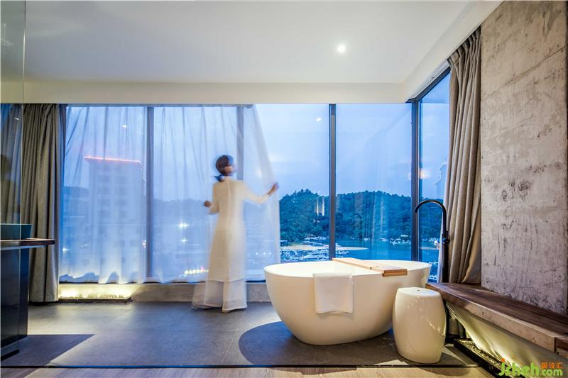 民宿的房間設(shè)計(jì)更多的考量了與萬(wàn)綠湖的互動(dòng)關(guān)系,在原有建筑格局當(dāng)中,盡可能的使用了透明的光面玻璃,創(chuàng)造了看湖的條件。巨幅透明光亮玻璃的使用確保了看湖風(fēng)景完整性的同時(shí),也豐富了建筑面和自然的過渡,形成“框景”的效果。這種“框景”的限定,使從民宿每個(gè)房間看出去,都能找到屬于自己的那一片與眾不同的湖景。與直接開放式的建筑觀景視野相比,“框景”的限定增強(qiáng)了內(nèi)部建筑與自然的結(jié)合,使景色的被攝取更具視覺沖擊。民宿多以實(shí)木裝飾,實(shí)木材料帶來(lái)的厚重感與質(zhì)感予人一種不同的感官體驗(yàn)。家具陳設(shè)繼承了傳統(tǒng)家具的線條語(yǔ)言,深木色勾勒形成框架機(jī)體,與灰色墻面完成了很好的和諧。床尾凳打破床尾的單調(diào)呆板,增加臥區(qū)空間的含蓄感。衛(wèi)浴區(qū)大型玻璃落地窗引進(jìn)風(fēng)景,泡浴山湖陪侍,何等愜意。每個(gè)房間內(nèi)置了大小不同的茶臺(tái),一為客家以茶會(huì)八荒,二為希望來(lái)客在這綠水青山中,聞香品茗,找到屬于自己的靜謐。