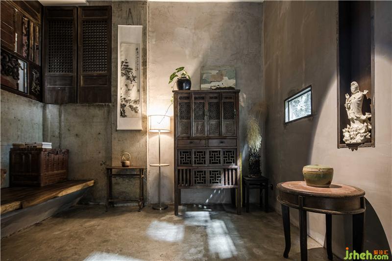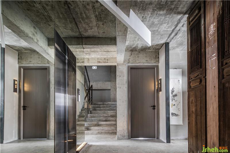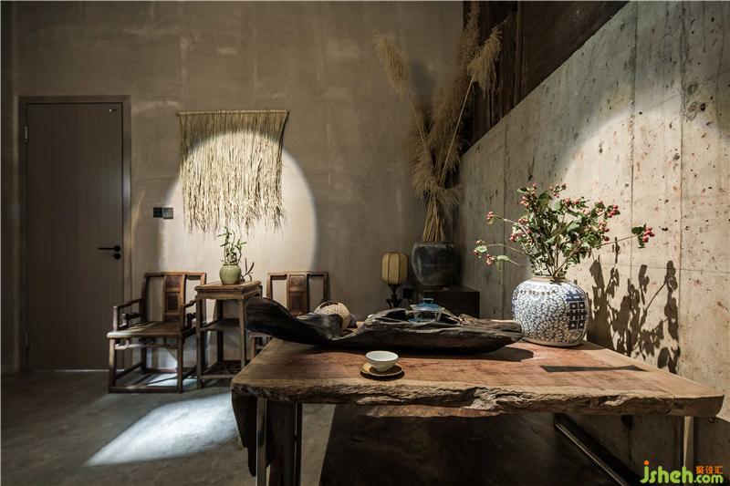 簡(jiǎn)約是大堂的調(diào)性,進(jìn)門左側(cè)瓶中放置蘆葦插飾,休息區(qū)以沙漏狀黑色矮凳標(biāo)識(shí)出來(lái),配合充滿懷舊氣息的銅壺和茶碗意境十足。點(diǎn)睛之筆是墻上交錯(cuò)對(duì)仗的黑色置物格里的茶葉罐。意為以茶會(huì)友,左右以建筑豎中軸線為分割,劃分成不同的功能區(qū)。玻璃外立面與“心·谷”生態(tài)缸相呼應(yīng),自然光由外入內(nèi),形成更加通透的空間視覺。休息區(qū)面對(duì)接待臺(tái),陳舊的老樹木根年代感十足,環(huán)繞臺(tái)前。電梯左側(cè)墻面的金屬鏡面反射裝飾陳設(shè),擴(kuò)大了視覺面積。不規(guī)則條狀燈掩蓋吊頂?shù)目瞻?,輝映其中。婉約的茶師佳人素手制茶,質(zhì)感十足的銅壺煮開沸水,澆灌至蜷縮的茶葉上便茶香四溢,香煙裊裊,思緒像是飄至遠(yuǎn)山,輕松自在,悠然愜意。