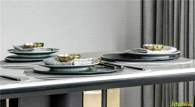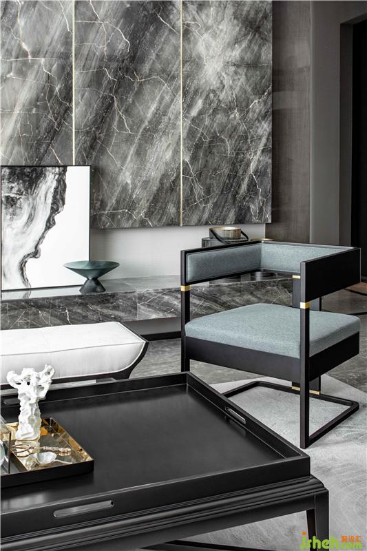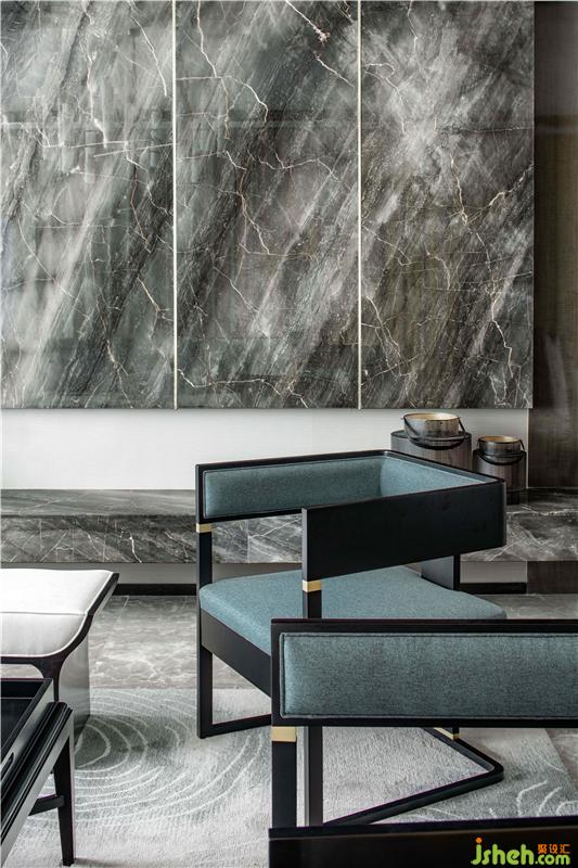 項目以沈著內(nèi)斂、具備厚重感的棕色木材、氤氳著斑駁紋理的大理石為地面,色彩的厚重感在很好地呼應了華貴又低調(diào)內(nèi)斂的項目調(diào)性,同時跟空間的淡色系、水綠色形成對比,加強空間視覺層次感。