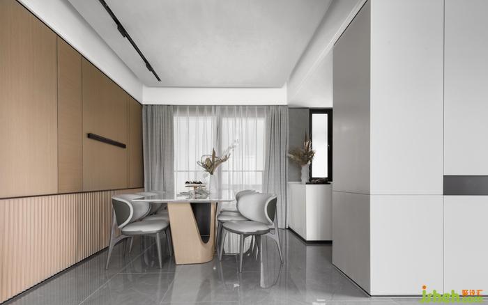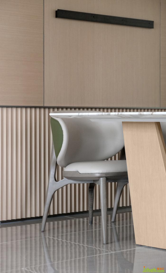 餐廳的功能承載了家庭成員共同相處的大部分時間,展開生活的無限可能。設計師以直線構(gòu)建空間的秩序感和簡明利落的格調(diào),以大面積灰色調(diào)鋪陳出主要的氛圍,餐椅的生理曲度弧線和皮質(zhì)舒適質(zhì)感,在細節(jié)之處傳達著生活中儀式感。樣板房設計