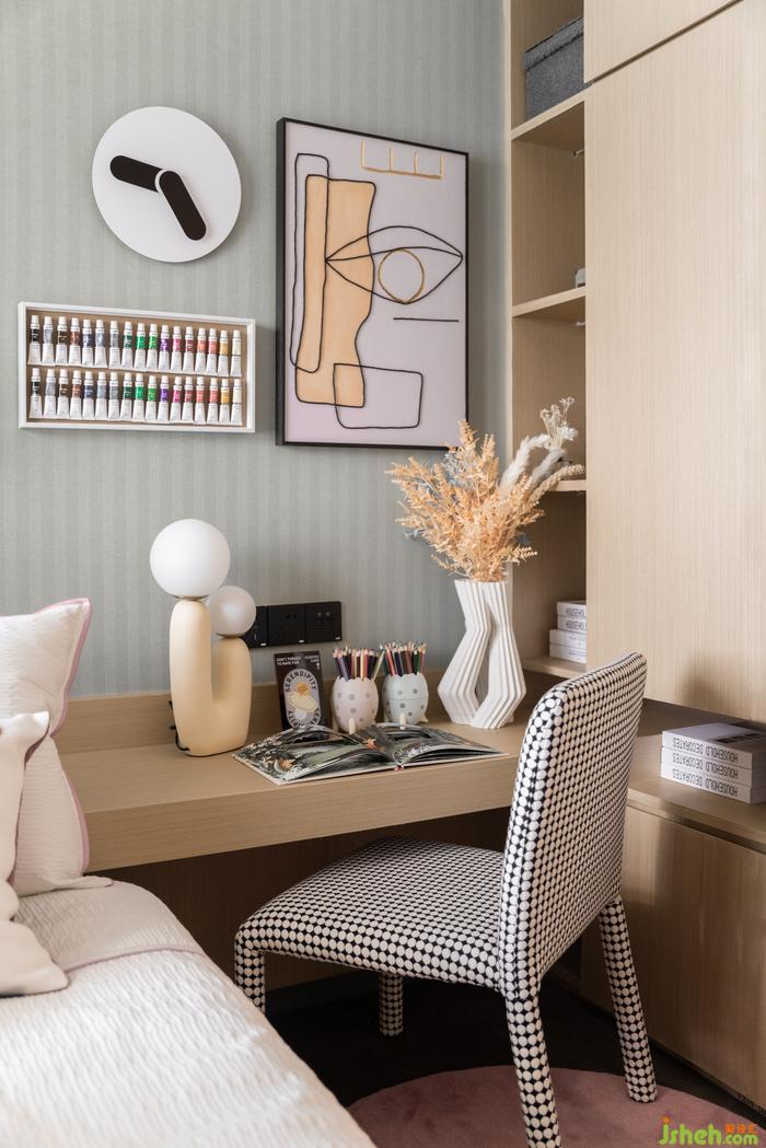 兒童房溫馨爛漫的粉色橘色與青色邊界分明,產(chǎn)生鮮明的對比和活躍的生命力。