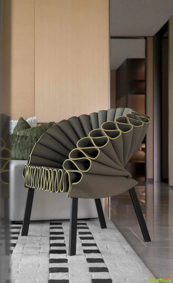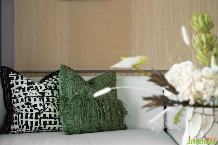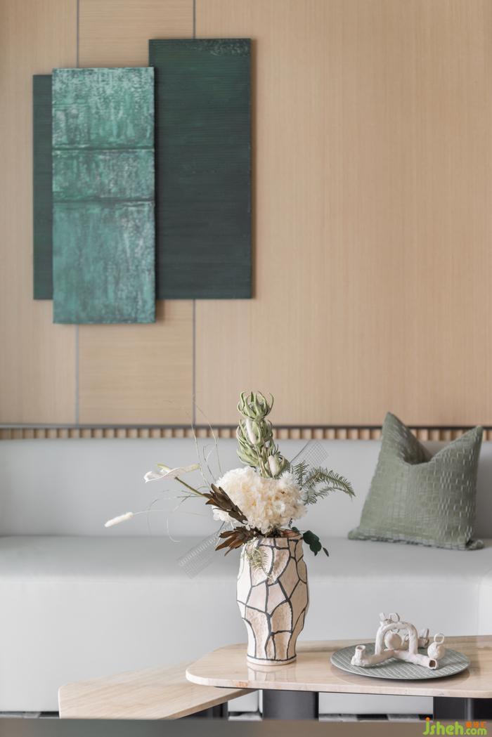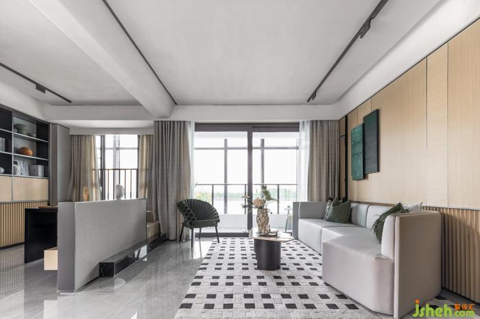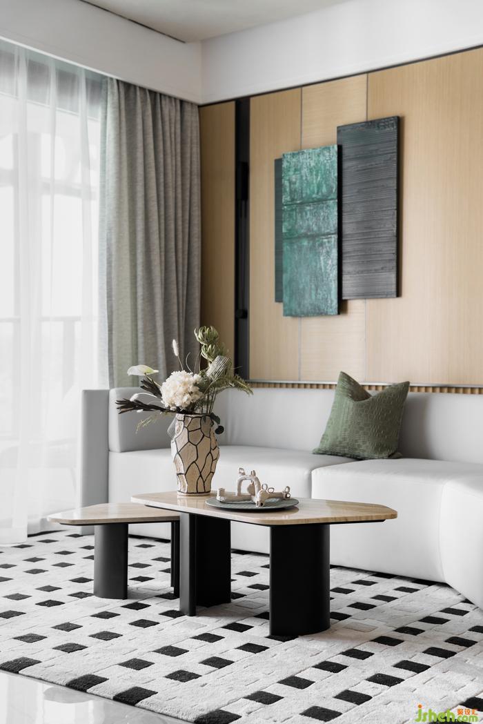 對于交流和共享屬性更高的的客廳,樣板間設計師在陳設上降低空間視覺重心,選用低矮沙發(fā)和家具,強調談話交流的親密感與舒適度。在多種材質與色彩的混搭下,設計開啟生活多元的空間體驗。