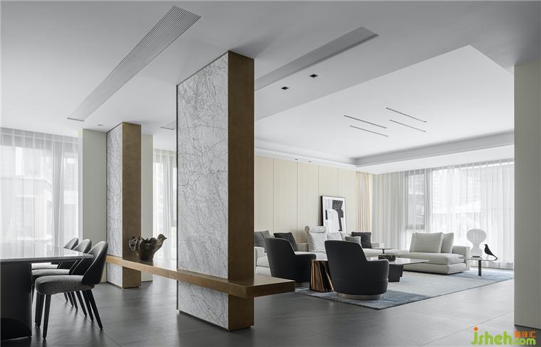 設(shè)計從返璞歸真的東方哲學(xué)出發(fā),廚房和餐廳的打通,通透的玻璃門,大面積的落地窗,還有原有結(jié)構(gòu)的柱子經(jīng)過天然石材的美化,豪宅設(shè)計通過材質(zhì)的變幻構(gòu)筑當(dāng)代設(shè)計語境,使這個空間契合形成了對望、對話。