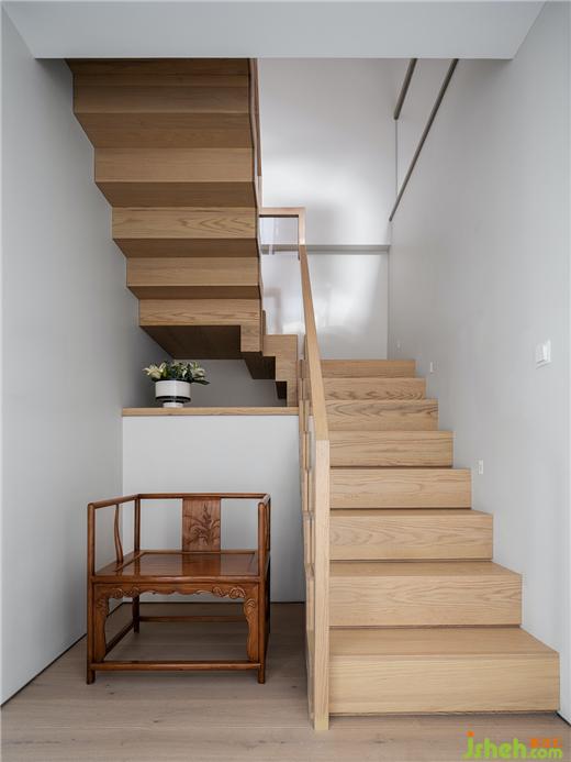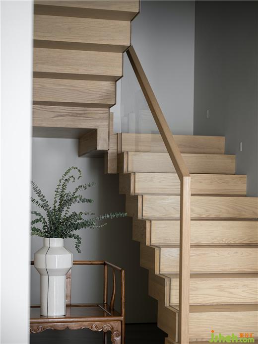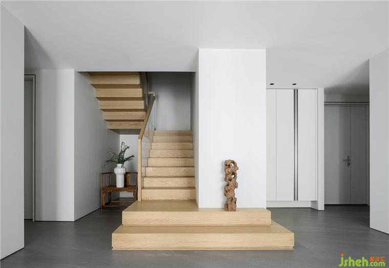 樓梯坐落于客廳一側,豪宅設計師運用極簡現代藝術的設計手法,融入木雕、木紋、中式扶手椅等人文藝術,在空靈與東方意境中凝練出獨特的空間氣質。