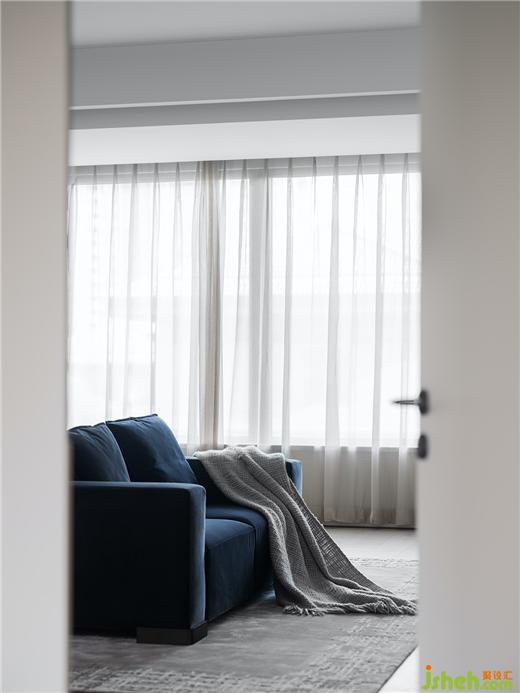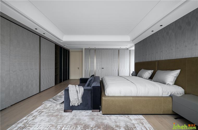 主臥室延續(xù)了公共區(qū)域的風格,采用極簡現代的設計風格,詮釋越簡單、越舒適的美學原則,全景落地窗搭配優(yōu)雅的皮質軟包床和深藍色沙發(fā)讓整個空間清爽又高級。