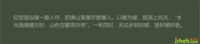 巨型望遠(yuǎn)鏡一眼入簾,營銷中心設(shè)計把佛山美景盡數(shù)攝入。以鏡為媒,觀湖上風(fēng)光,“水光瀲滟晴方好,山色空蒙雨亦奇?!币荒晁臅r,無論歲轉(zhuǎn)時移,皆為好景好色。